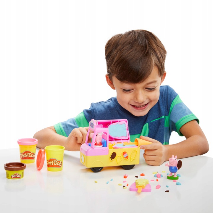 Розважтеся у вантажівці з морозивом — усередині фургона є змінні форми, які можна використовувати для виготовлення морозива, ріжків тощо. У набір входить фігурка свинки Пеппи з печаткою - можна поставити в машину! Приготуйтеся до чудових розваг із Play-Doh і свинкою Пеппою!