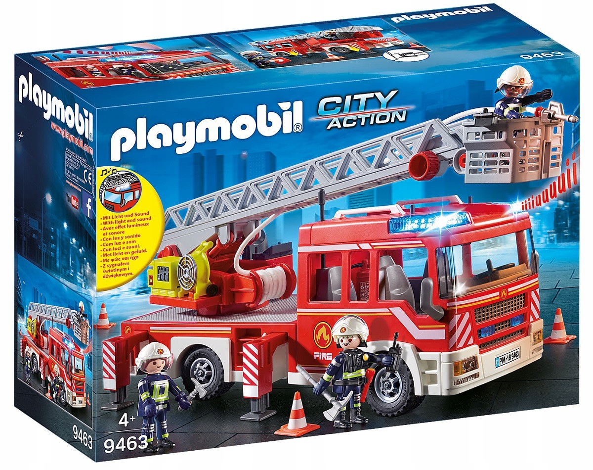 Пожежна машина з драбиною - транспортний засіб має висувну драбину з кошиком, 3 пожежних та аксесуари. Має світлову та звукову сигналізацію. Транспортний засіб, сумісний з модулем дистанційного керування RC із висувною драбиною. З висувними опорами. У кабіні водія можна розмістити максимум 4 фігурки.