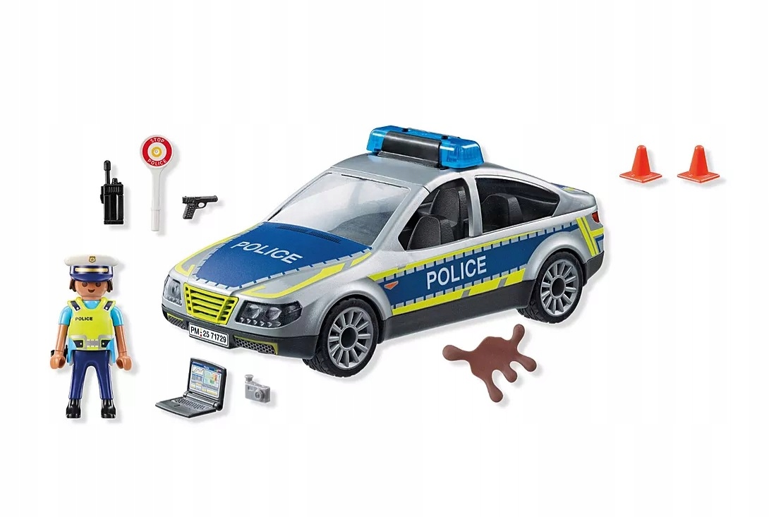 Accessories: 1 radio car with a light and sound module, 1 holster with pistol, 1 reflective vest, 1 portable radio, 1 Notebook, 1 police trowel, 1 oil stain, 2 traffic bollards