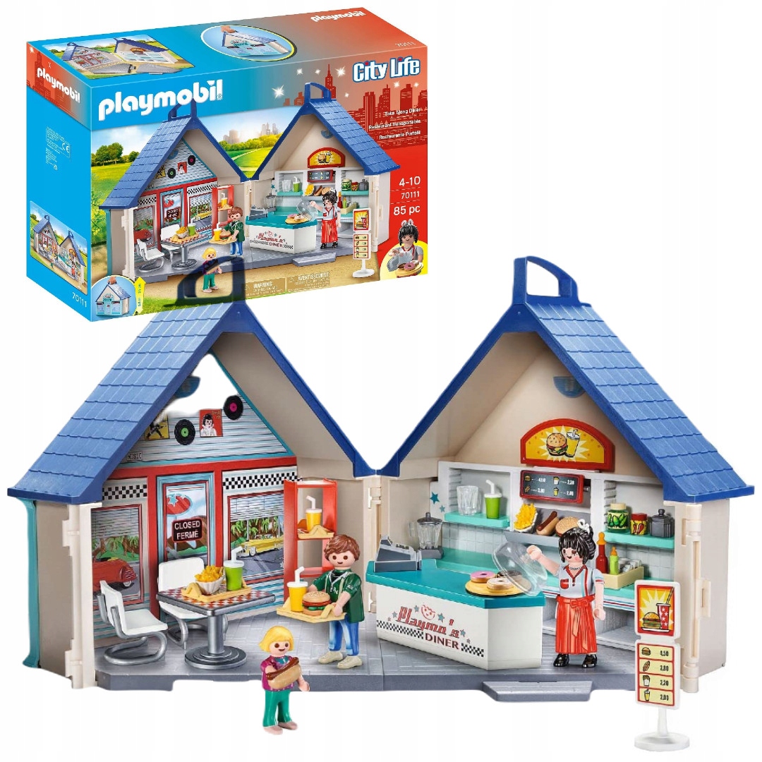 Портативна їдальня Playmo's — це місце, де кожен знайде щось для себе. Там подають найкращі бургери в місті. Дуже приємна офіціантка завжди готова допомогти. Playmobil представляє портативний бар, оснащення якого вас порадує! Набір створений для зручного перенесення - він має зручну ручку. У ресторані дуже реалістичне обладнання, багато страв, від картоплі фрі до пончиків. Замовлення можна віднести до столу на підносі. Продавець має в своєму розпорядженні касовий апарат.