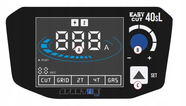 Фреза EASYCUT 40SL має просту у використанні функціональну панель із ручкою, що забезпечує плавний і точний струм регулювання різання в діапазоні 20 - 40А. Передня панель різака оснащена: