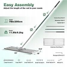 Удосконалена жорстка штанга для згрібання: ця штанга для згрібання виготовлена з потовщеної нержавіючої сталі 304 для більшої стабільності та довговічності, ніж стовпи з алюмінієвого сплаву, які є у більшості інших інструментів для вирівнювання. Він не зігнеться та не трісне, що робить його надійнішим вибором для роботи у дворі.