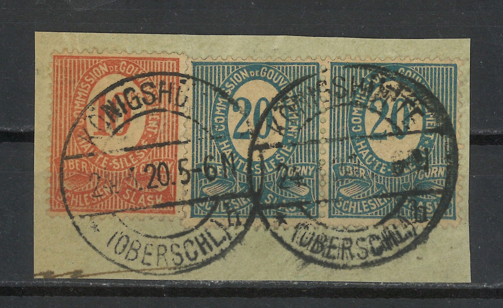 Три марки на вирізці з Верхньої Сілезії.