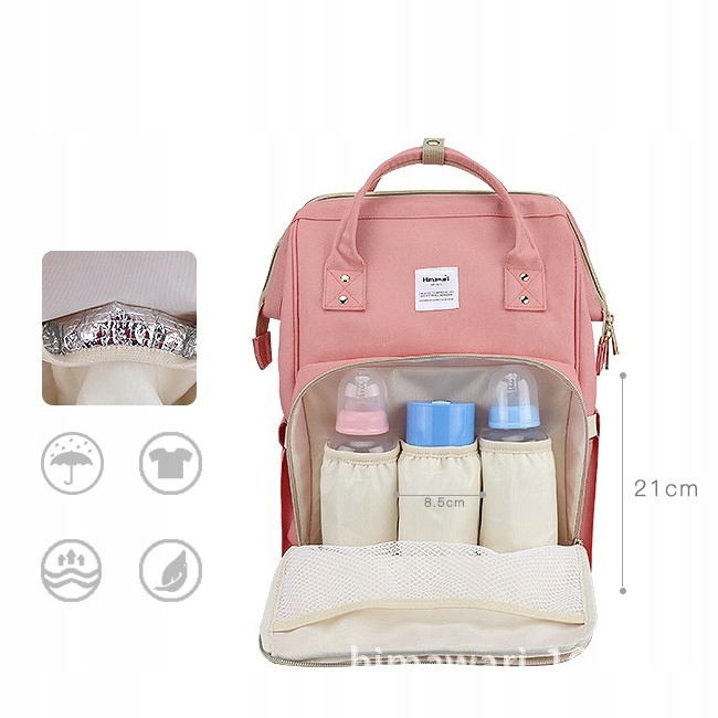 Рюкзак для підгузків Himawari HM1213 Carnation для мами b> - дуже містка модель, виготовлена з міцного і водонепроникного матеріалу. У цьому добре спроектованому рюкзаку є місце для всіх речей, які вам знадобляться, коли вирушаєте з дитиною. Пляшки з молоком, серветки та навіть брудні підгузки - для всіх цих речей є спеціальні кишені. Крім того, всередині також є чотири великі кишені і кишеня на блискавці. Ще одна кишеня на блискавці розташована на зовнішній стороні рюкзака. По основному краю рюкзак має дротяне підсилення, схоже на сумку лікаря, завдяки чому в розкритому стані рюкзак жорсткий, що забезпечує легкий доступ до всіх речей всередині. Доступ до внутрішньої частини також можливий, не відкриваючи основну застібку - для цього на задній частині рюкзака є клапан на блискавці. З боків рюкзака є дві кишені, одна з яких призначена для зберігання серветок - має спеціальний отвір на блискавці, через який їх можна вийняти. Рюкзак, крім лямок для носіння на спині, має дві ручки, які можна скріпити разом і зручно носити як сумку.