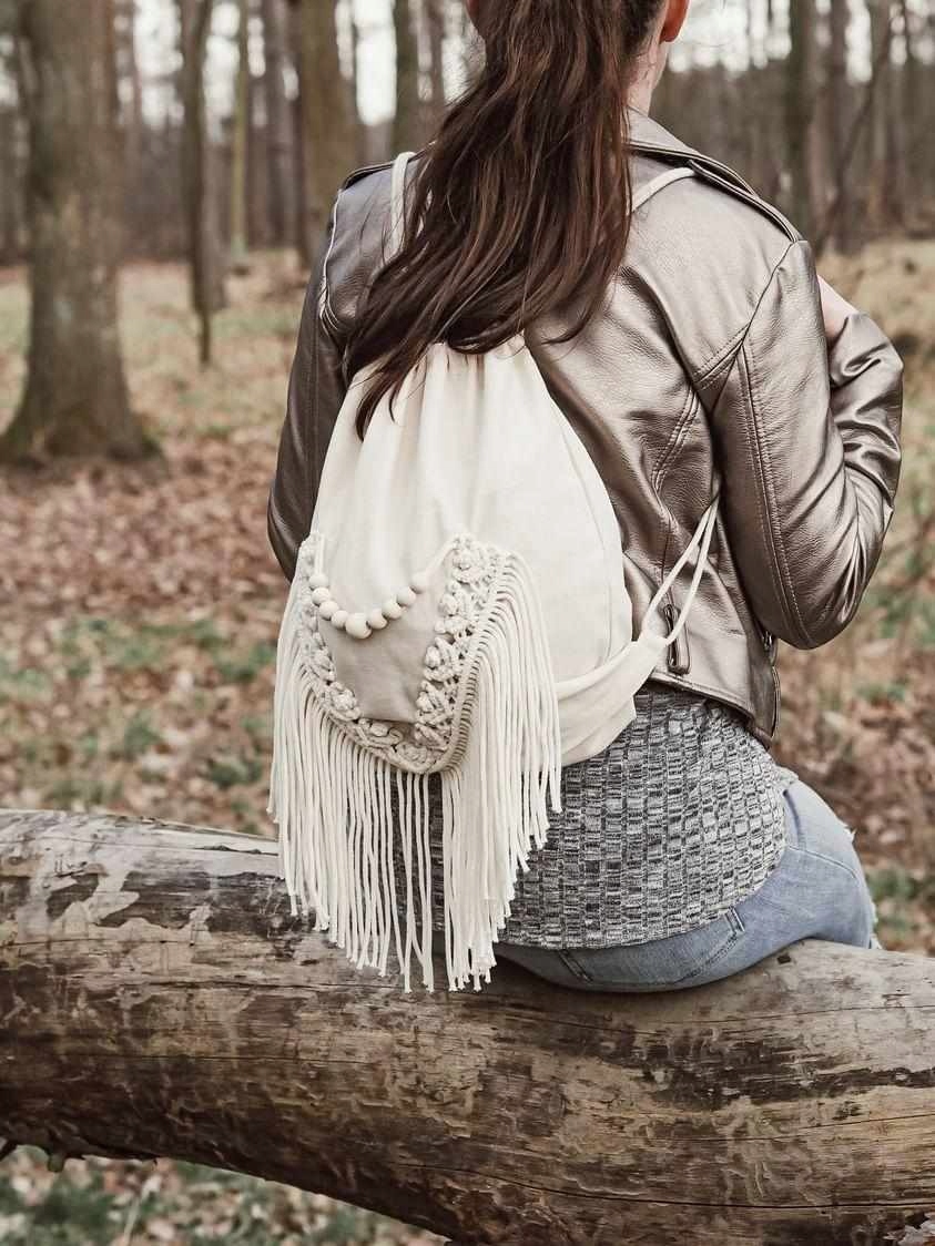 Рюкзак "Індиго" - чудовий варіант для походів або подорожей! Рюкзак - сумка має малюнок макраме, пришитий на швейній машинці до тканини в двох місцях, завдяки чому малюнок щільно тримається на рюкзаку. З візерунка макраме звисають вільні нитки, які додають всьому шарму. Вишенькою на торті є вшиті в матеріал намистини на нитці.