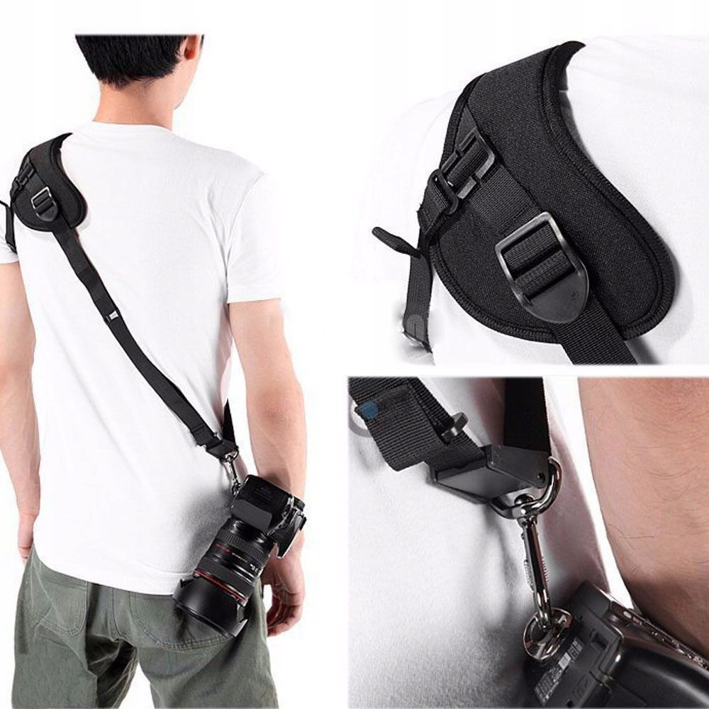 Швидкий фокус -ремінь забезпечує безпеку та стабільність обладнання навіть у найважчих ситуаціях. Перемістіть камеру до пояса, щоб зафіксувати ідеальний знімок. Фокус робить фотографію приємнішою. Дуже велика губка на плечовій подушці дає вам ідеальний комфорт використання