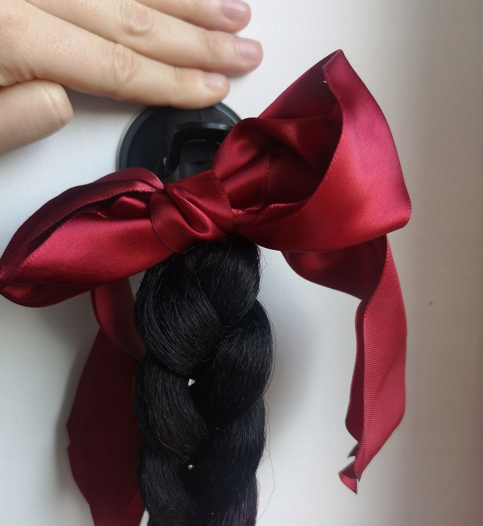 Синтетичне двоколірне волосся, заплетене в косу, з бантом бордового кольору вгорі. p>