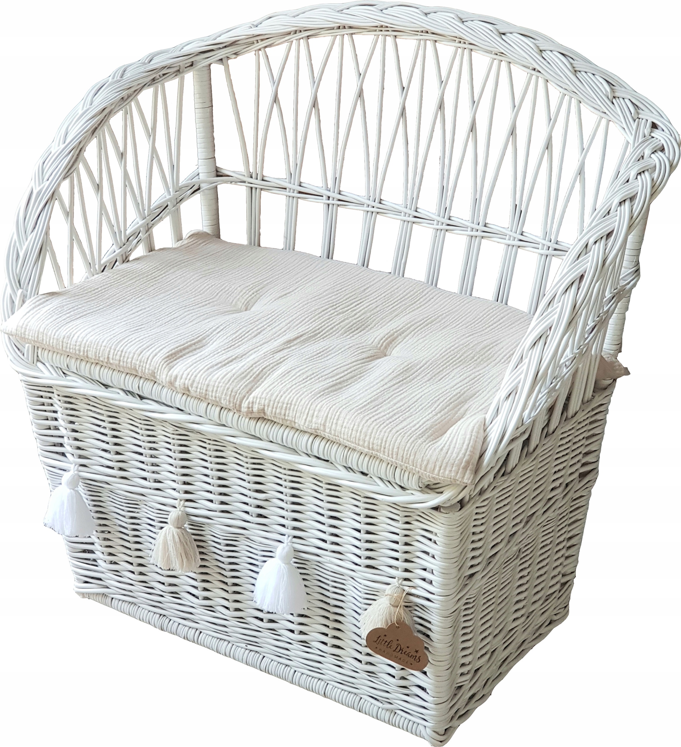 Чудовий предмет меблів для прикраси дитячої кімнати тощо. Він буде служити і сидінням, і місцем для зберігання іграшок. До сидіння кріпиться м'яка подушка з ніжного і приємного на дотик мусліну натурального кольору, наповненого антиалергічним флізеліном. Китиці можна розв’язати та прикріпити в іншому місці.