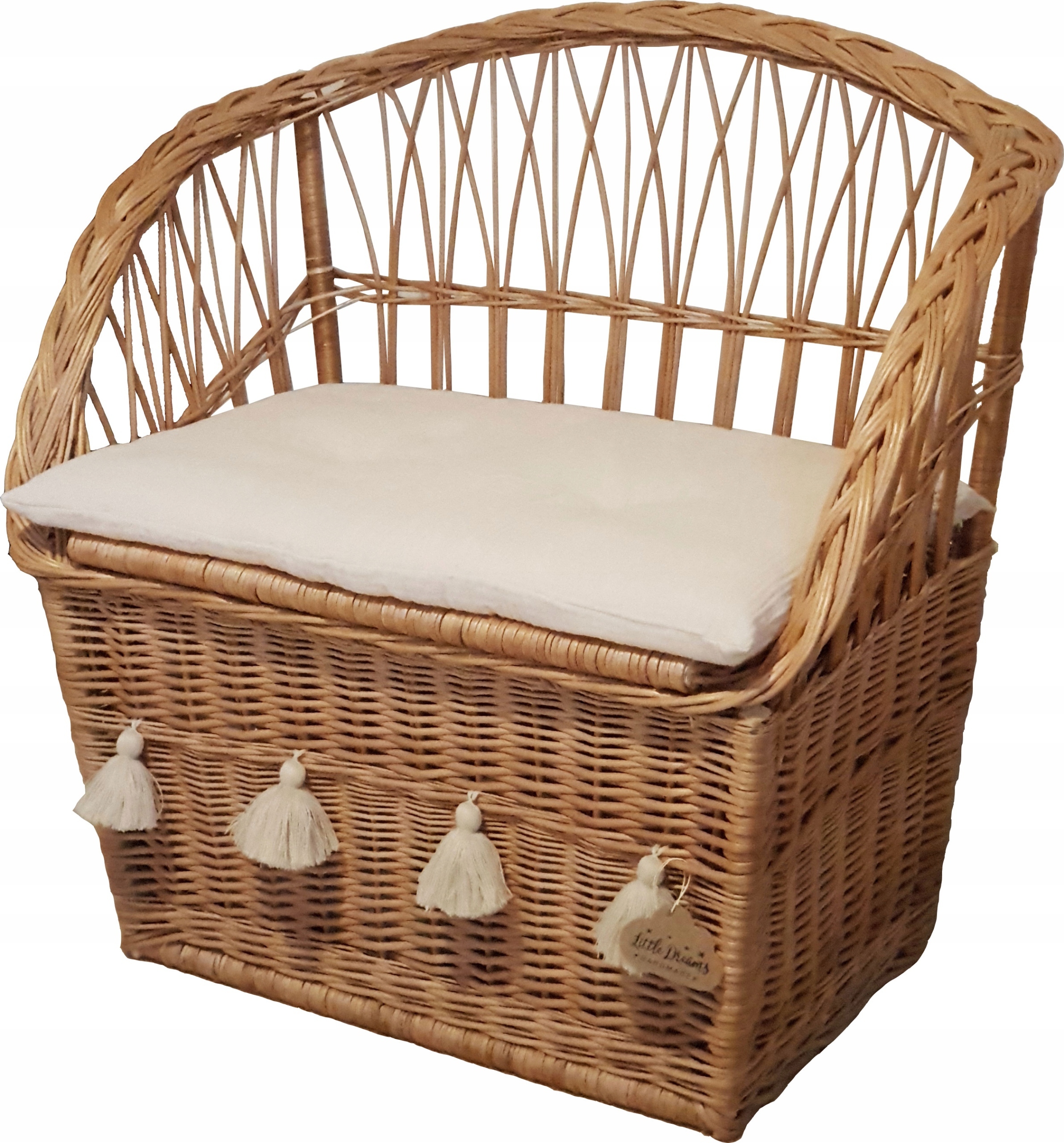Чудовий предмет меблів для прикраси дитячої кімнати тощо. Він буде служити і сидінням, і місцем для зберігання іграшок. До сидіння кріпиться м'яка подушка з ніжного і приємного на дотик мусліну натурального кольору, наповненого антиалергічним флізеліном. Китиці можна розв’язати та прикріпити в іншому місці.