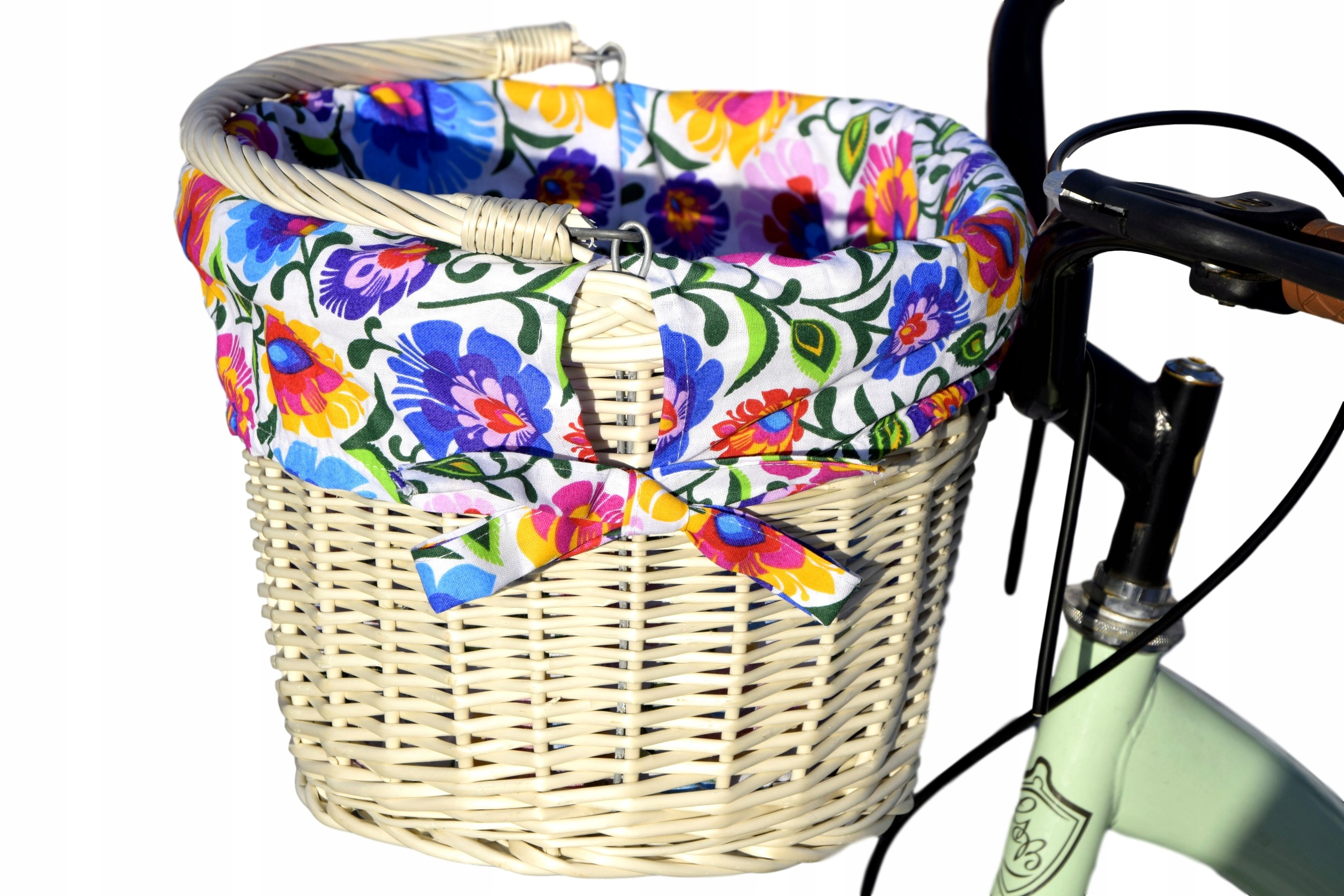 Плетений кошик для велосипеда з гачками З БІЛОГО ПЛОЩЕННЯ (НЕ ФАРБОВАНИЙ - білий з ніжним кремовим кольором) + ПОДкладка - колір підкладки на вибір - кошик ідеально підходить для велосипедних прогулянок і шопінгу. Ретельне виготовлення та міцна конструкція забезпечують безпечне та зручне перенесення покупок. Кошик розміщується на передній частині керма за допомогою відповідним чином зігнутих металевих стрижнів, захищених спеціальним пластиком.