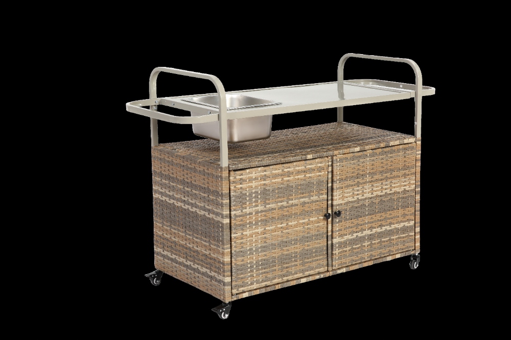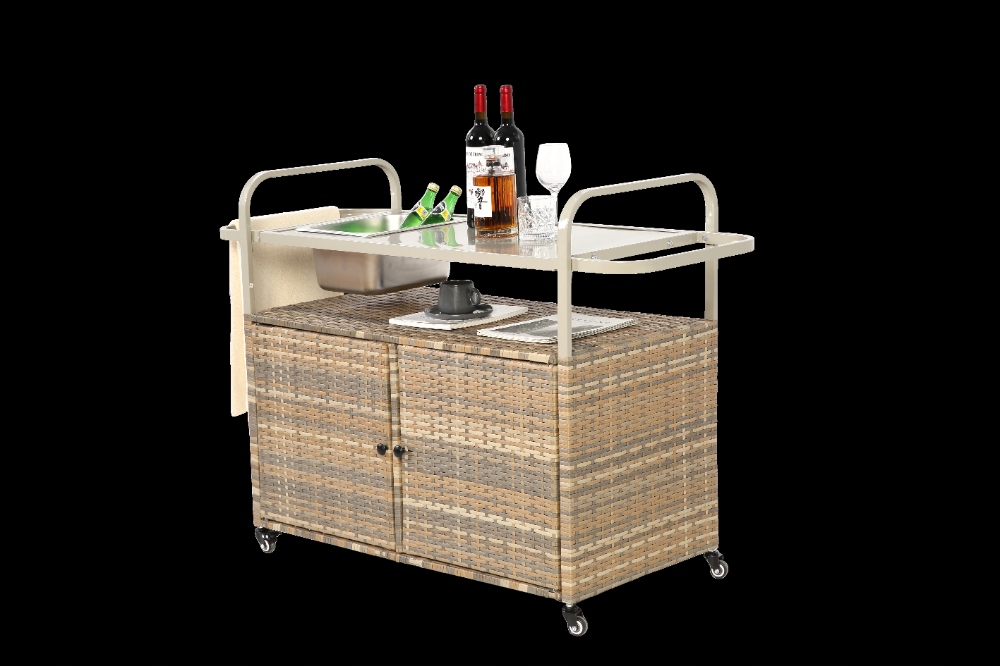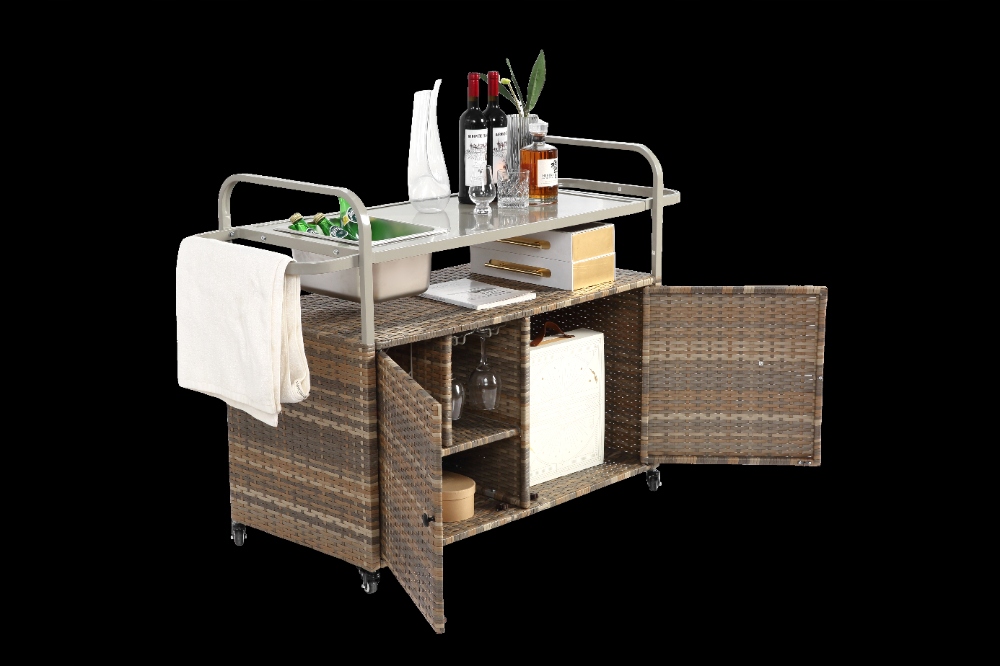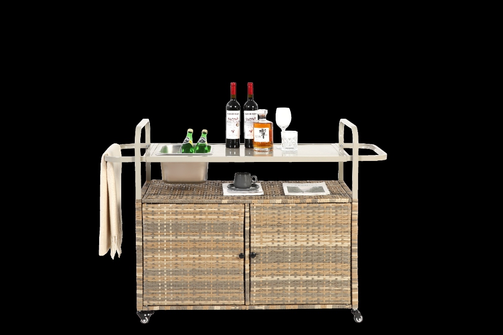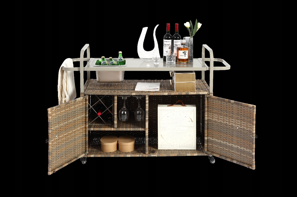 Плетений візок для сервірування патіо з барною стійкою та шафою, бежевий