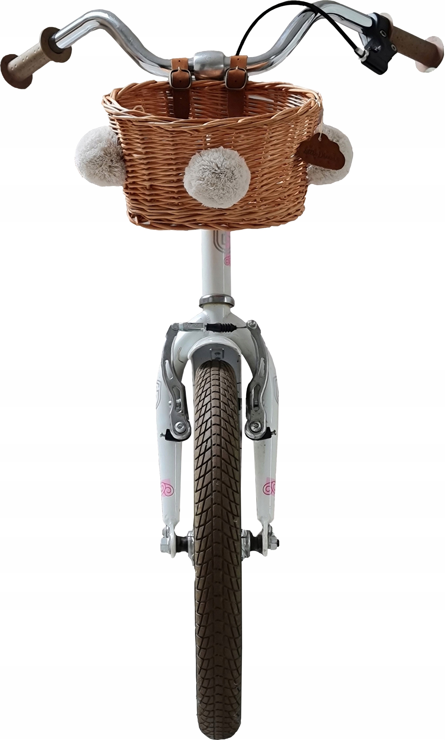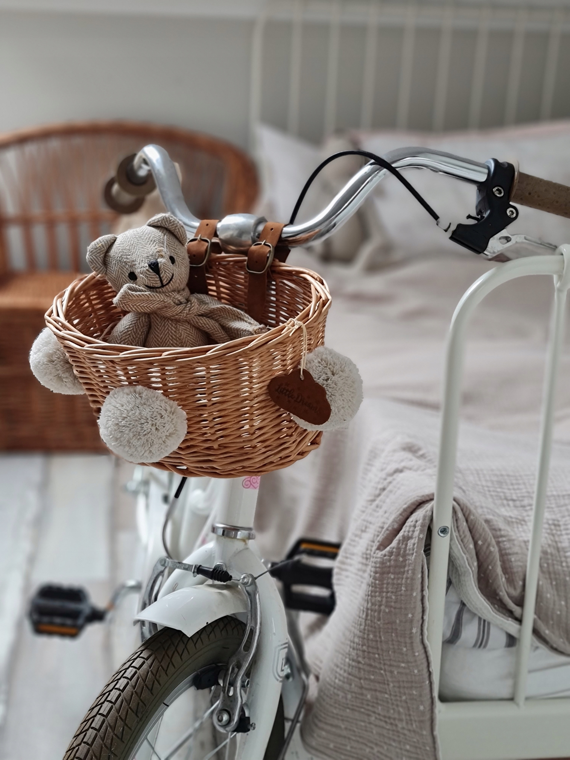 Красивий плетений кошик для велосипеда з ремінцями з екологічної шкіри. Для найнеобхідніших скарбів маленького мандрівника.