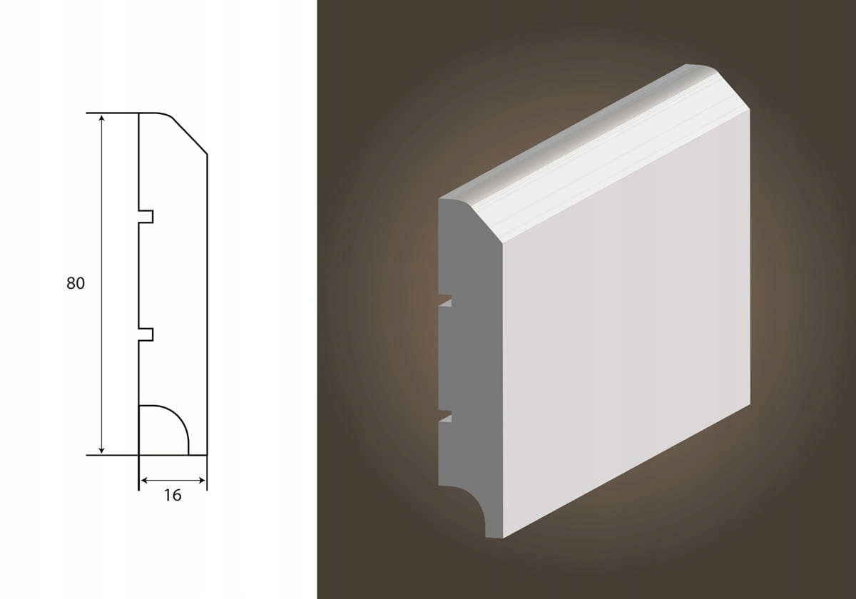 Плінтус Classic 45 Plus виготовлений з високоякісного деревного матеріалу середньої щільності МДФ. Плінтус додатково має виїмки для проводки кабелів і, що найголовніше, він має вологостійкі властивості. Завдяки цьому продукт також можна використовувати в таких приміщеннях, як ванні кімнати та чихалки.