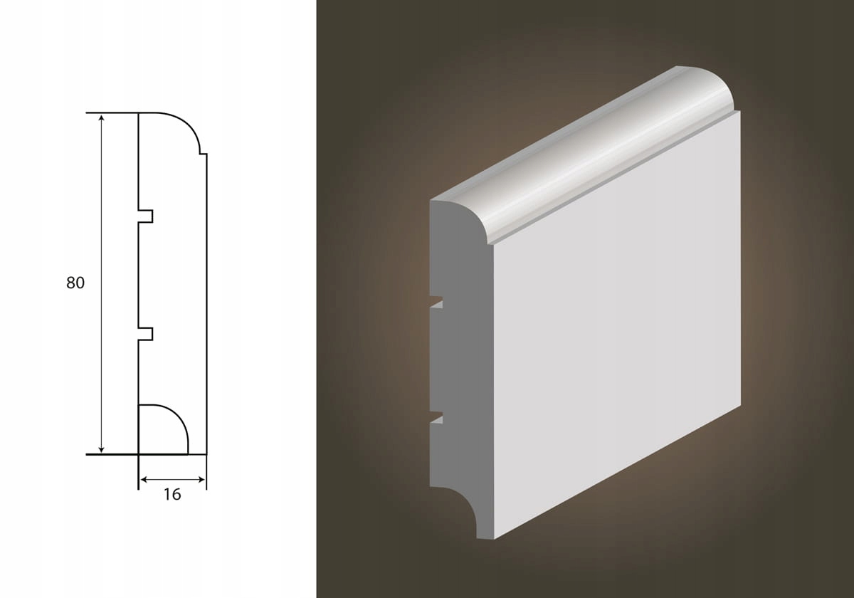 Плінтус Classic R10F Plus виготовляється з МДФ, тобто деревної плити середньої щільності. Крім того, він має фрезерування для кабелів і різці для покращення кріплення до стіни. Будь ласка, пам’ятайте, що поверхня, на яку буде кріпитися стрічка, є сухою, чистою, гладкою та знежиреною.