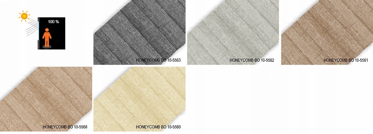 HONEYCOMB BLACKOUT - матеріал комбінований з двох складок. Для тканини «соти» характерні менші складки в складці. У розрізі нагадує стільники. Завдяки спеціальній структурі з мікроперфораціями та внутрішньому алюмінієвому покриттю, він використовує повітряні камери для додаткової ізоляції (звуко- і теплоізоляції) і тим самим підвищує енергетичні параметри вікна. Влітку тепло ззовні зберігається, а взимку не виділяється з приміщення. Крім того, стільники підвищують естетичність інтер'єру, дозволяючи розмістити всередині тканини струнні механізми і напрямні. Додатковою перевагою цього рішення є відсутність розривів у місцях розташування ліній.