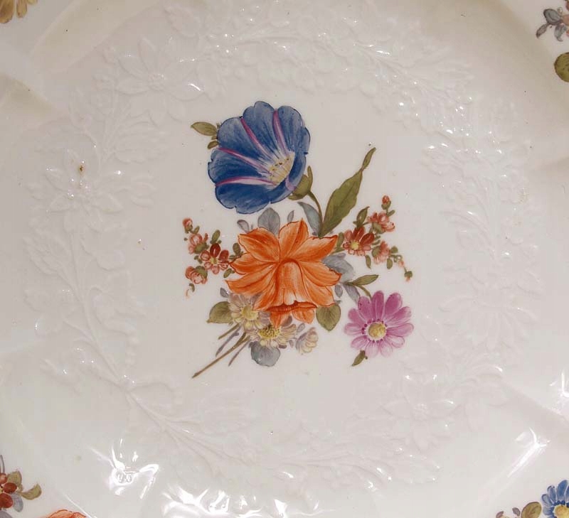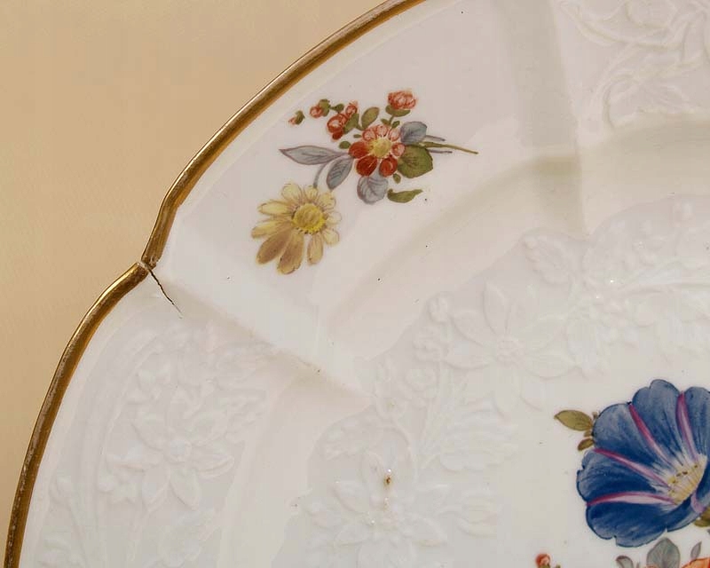 плитка, прикрашена виступами квіткових гілок на комірі та більшим букетом у дзеркалі. З рельєфом квіткових мотивів і позолоченим краєм коміра. На кромці є дефект, який утворився в процесі випалу. Унизу підписана підглазурована кобальтом, два схрещені мечі та масовий відбиток «22».