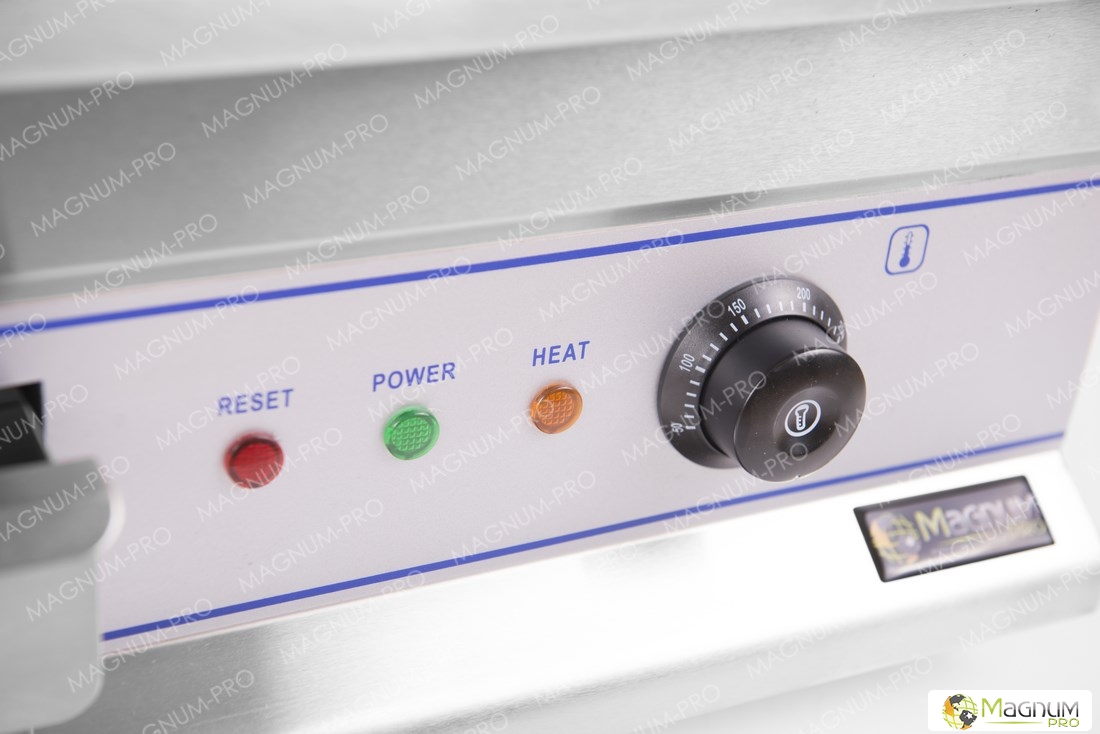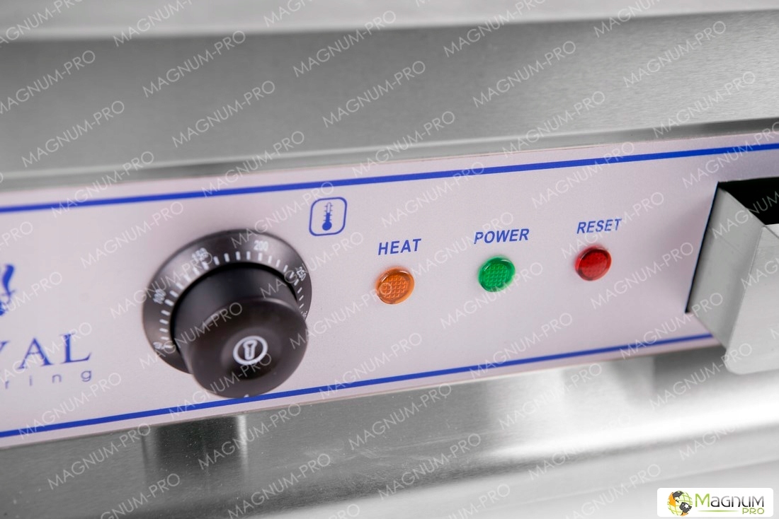Надзвичайно просте та інтуїтивно зрозуміле керування за допомогою двох незалежних термостатів із плавним регулюванням температури від 50 до 300 °C< /b >. Контрольні лампочки інформують нас про нагрівання та запуск машини. Пристрій має енергозберігаючу систему нагріву потужністю 2 х 3,2 кВт (дві вилки 230 В), яка гарантує швидкий і рівномірний нагрів всієї варильної поверхні.