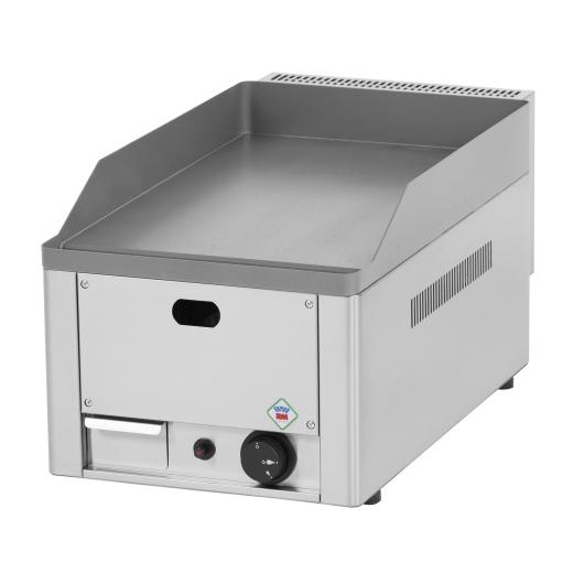 Гриль газова в корпусі з нержавіючої сталі. Гладка стільниця зі зносостійкої сталі. Призначений для смаження м'яса та овочів на грилі. Робоча плита має бортики, які запобігають випаданню продуктів з пристрою. Товщина дошки 12 мм гарантує правильний розподіл тепла по всій поверхні. П'єзоелектричний запальник. Ящик для жиру та залишків випічки. Пристрій поставляється з встановленими газовими форсунками пропан-бутан. Додатково в комплектацію входить форсунка для природного газу GZ-50.