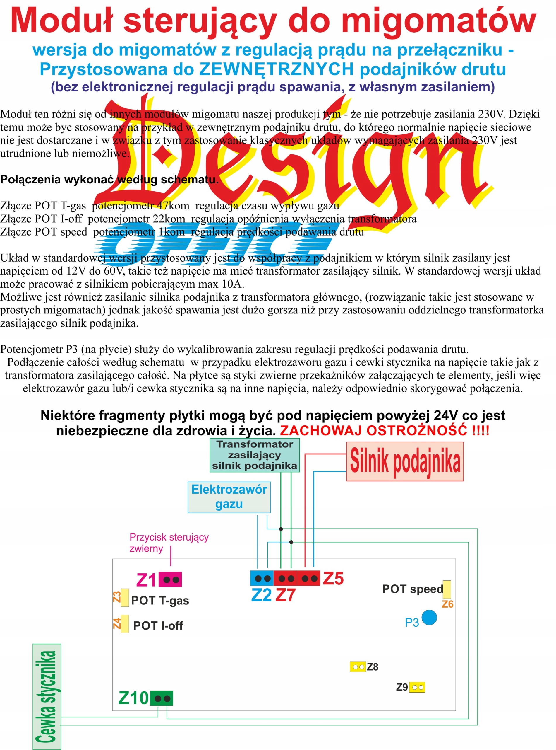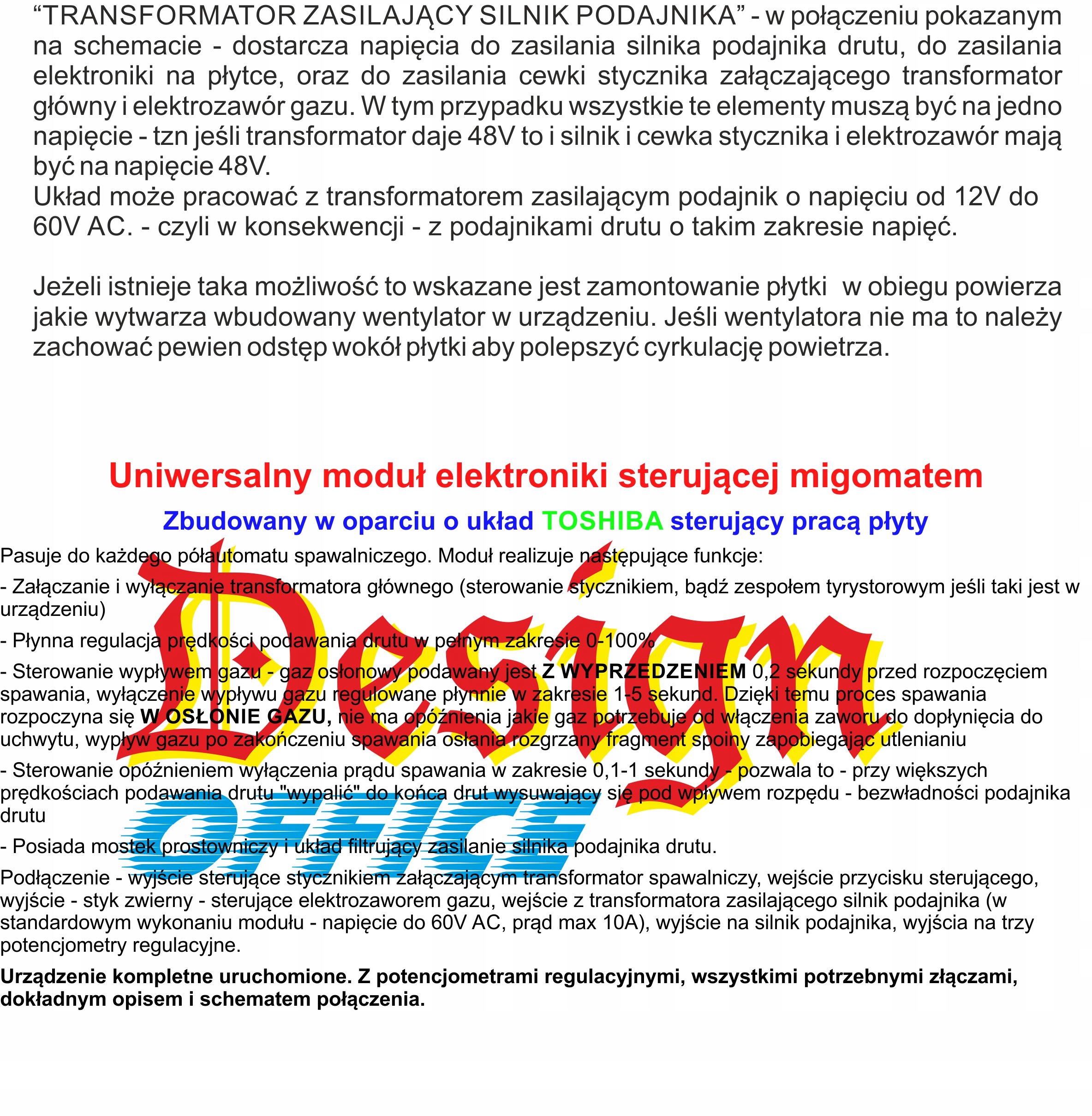 Встановлюється на будь-який зварювальний напівавтомат із класичним трансформатором. Даний модуль відрізняється від інших модулів мігомат нашого виробництва тим, що не потребує живлення 230В. Завдяки цьому його можна використовувати, наприклад, у зовнішньому пристрої подачі дроту, до якого зазвичай не подається мережева напруга, і тому використання класичних систем, що потребують джерела живлення 230 В, є складним або неможливим. Стандартний варіант системи розрахований на роботу з фідером, в якому двигун живиться напругою від 12В до 60В, а трансформатор, що живить двигун, повинен мати таку ж напругу. У стандартній версії система може працювати з потужністю двигуна до 10 А.