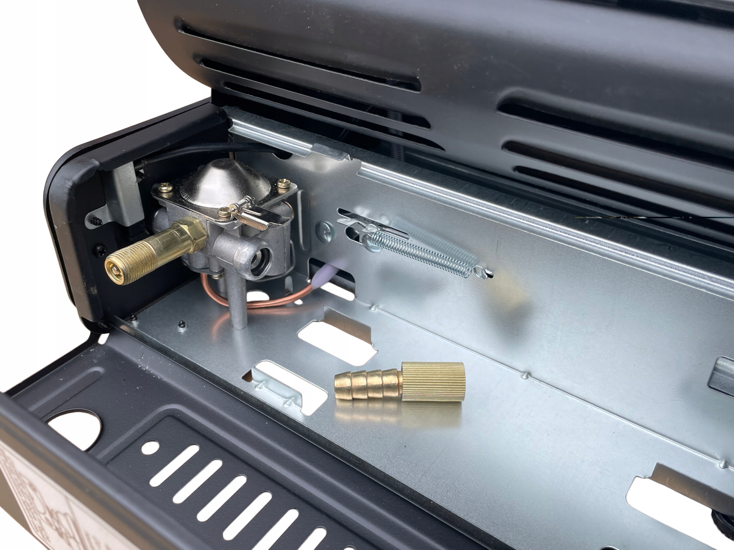 Плита працює на газових балонах, але також має можливість підключення до великого газового балона. Редуктор в комплекті!