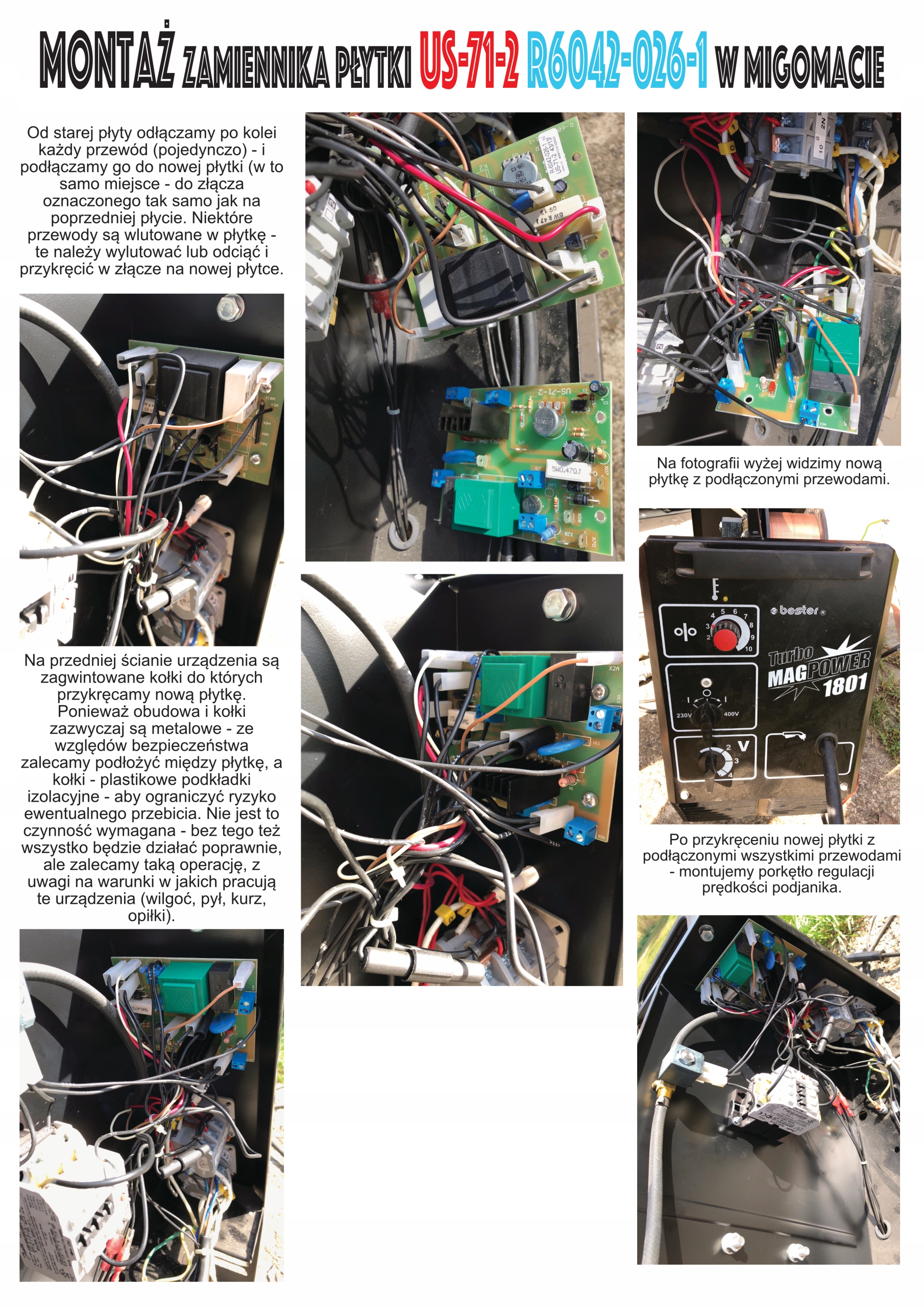 - чому немає проводів, а є в оригіналі? Це справді полегшує встановлення. Провід у зварювальному апараті зв’язаний у пучки – заміна пластини з дротами передбачала б розрізання всього пучка, повторне прокладання проводів і потім з’єднання. У цьому випадку - просто відпаяти дроти від старої плати або обрізати їх прямо біля плати і підключити до роз'ємів (затягнутих викруткою) на новій платі. Набагато менше роботи для вас - тих, хто його замінює - і для нас - тому що додаткову роботу довелося б витратити на виготовлення кабелів - які вже є у вас...