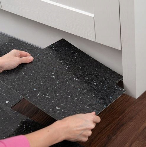 Самоклеюча ПВХ плитка є ідеальним продуктом для людей, які хочуть зробити швидкий, дешевий і простий у використанні ремонт. Тильна сторона плитки має міцний клей, захищений захисним папером, який слід обережно зняти під час монтажу та приклеїти плитку до гладкої поверхні, яку потрібно приклеїти. Для складання не знадобляться додаткові клеї або спеціальні інструменти. Усі корисні аксесуари для складання: