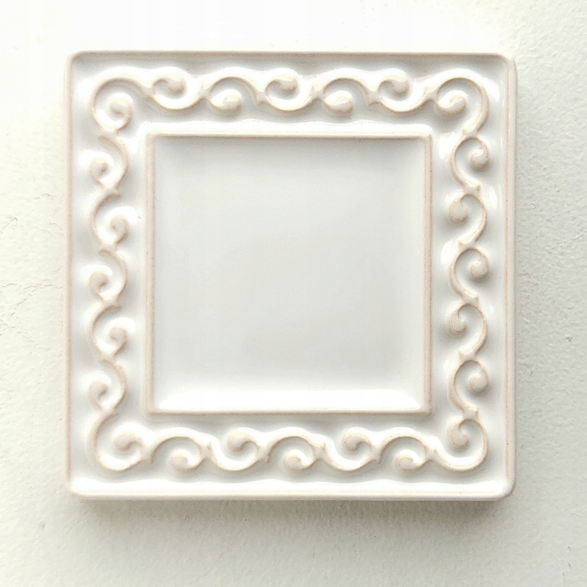 Настінна керамічна плитка зі злегка опуклим складним орнаментом. Виготовлена вручну зі світлої глини, вкрита блискучою глазур'ю, що підкреслює малюнок опуклого орнаменту. Двічі обпалений при високій температурі. Стійкість до води, стирання, високих і низьких температур. Монтаж як стандартна плитка. Рекомендую.