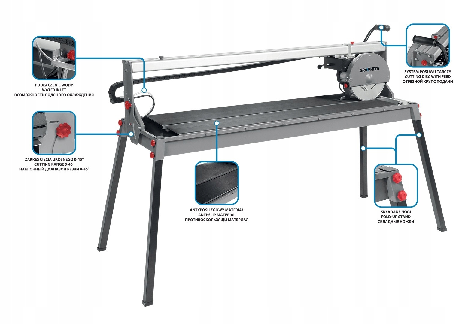 Плиткоріз 1500 Вт, 250 х 25 мм, діапазон різання 1200 мм, кабель 3 м 59G892 фірми GRAPHITE - спеціалізований пристрій потужністю 1500 Вт, призначений для точного різання плитки та каменю товщиною до 52 мм і максимальною довжиною 1200 мм. Інструмент характеризується діапазоном скошеного різання від 0° до 45°. Він має низку електричних засобів захисту, зокрема: УЗО ПРЧД, а також тепловий захист електродвигуна. Фреза оснащена направляючою ріжучої головки з алюмінієвого сплаву, стійкого до високих температур, і стільницею, покритою протиковзким матеріалом, що запобігає неконтрольоване переміщення матеріалів. Прилад має клас захисту I і ступінь захисту IP54. Ніжки фрези складаються, що полегшує зберігання або транспортування. Гнучкий і міцний кабель живлення захищений гумовим покриттям довжиною 3 м - рекомендовано для професійного та промислового застосування, як у приміщенні, так і на вулиці. Відповідність європейським стандартам підтверджено сертифікатом CE.