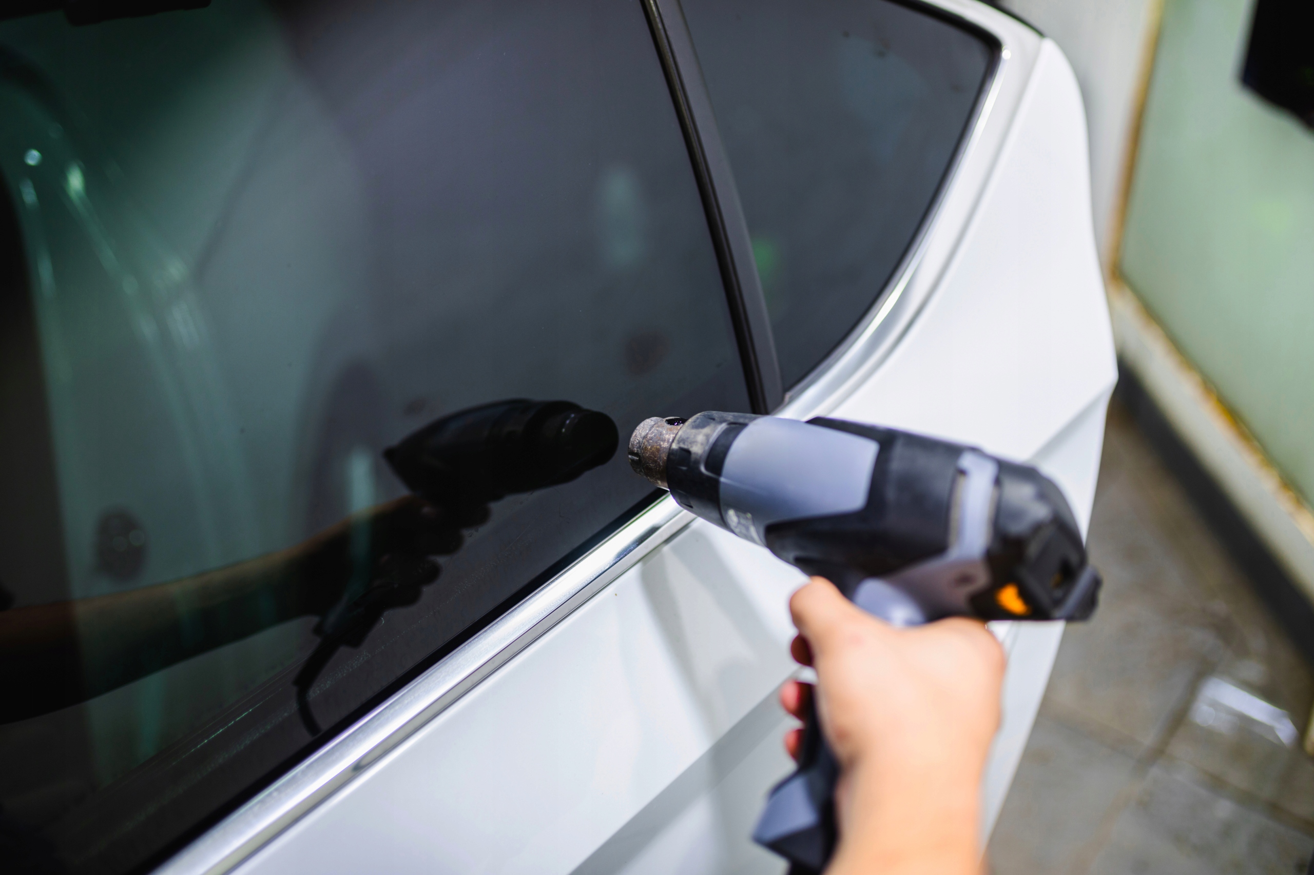 Плівка для тонування скла встановлюється зсередини. Профілюємо зовнішню сторону і нагріваємо фольгу термопістолетом, а потім, знявши захисний шар, наклеюємо фольгу на внутрішню сторону скла.