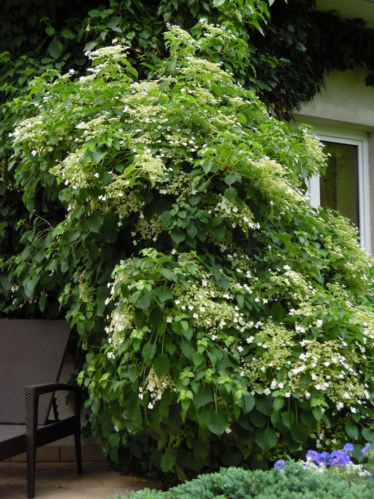 Рослина утворює на пагонах придаткове коріння, дуже схоже на коріння звичайного плюща. З їхньою допомогою він лазить по стовбурах і товстішим гілкам сусідніх дерев, каменів, стін або пористих стін будівель. Самі пагони, вкриті червоно-коричневою корою, що відшаровується, злегка хвилясті і прилипають до опор, складають цікавий колірний акцент, особливо в безлистий період.Овальні темно-зелені листові пластини, встановлені на тонких черешках, виростають до 10 див. в діаметрі і щільно покриває всі гілочки. Восени вони забарвлюються в теплий, золотистий колір, на рубежі червня і липня з'являються суцвіття, що складаються з двох видів квіток. Більші білі квіти, позбавлені маточки і тичинок, оточують ніжною хмарою лише краї пластинчастих суцвіть, внутрішня частина яких заповнена безліччю крихітних плідних аквамаринових квіток.Плоди, нічим не примітні коробочки, мають невелику кількість. декоративне значення, але засохлі суцвіття досить довго зберігаються на пагонах, прикрашаючи їх восени і взимку.