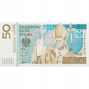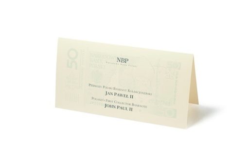 Банкнота колектора з номіналом PLN 50 із зображенням Іоанна Павла II у початковій справі банку. >