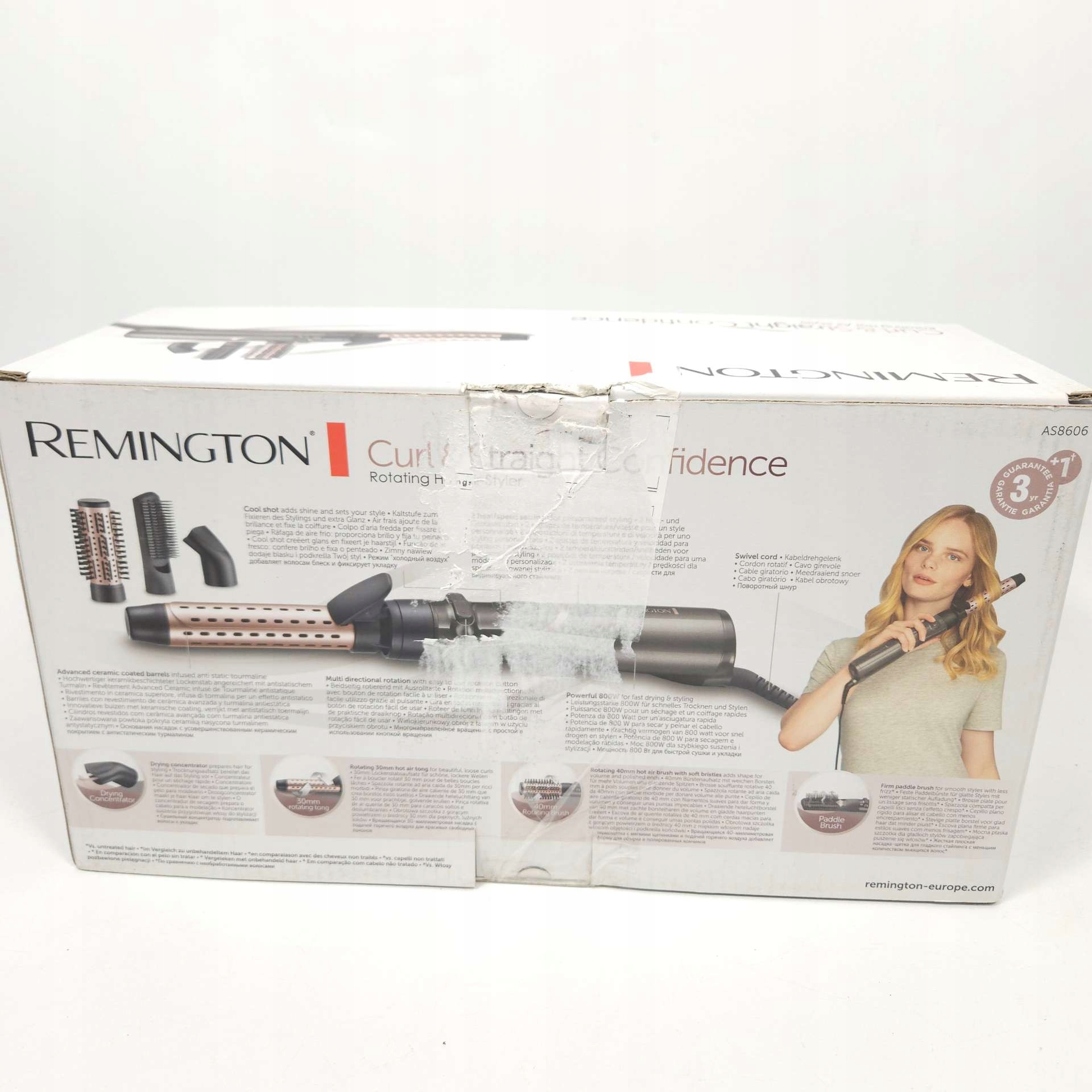 Плойка Remington AS8606 поєднує в собі функції сушіння та укладання волосся. Прилад потужністю 800 Вт оснащений технологією іонізації, яка допомагає зменшити статичну електрику волосся. У набір входять дві змінні щітки різного діаметру, призначені для укладання коротших і довгих пасом. Щітка, що обертається, полегшує укладання волосся, а функція прохолодного повітря дозволяє закріпити ефект. Прилад має регулювання температури та швидкості повітряного потоку.