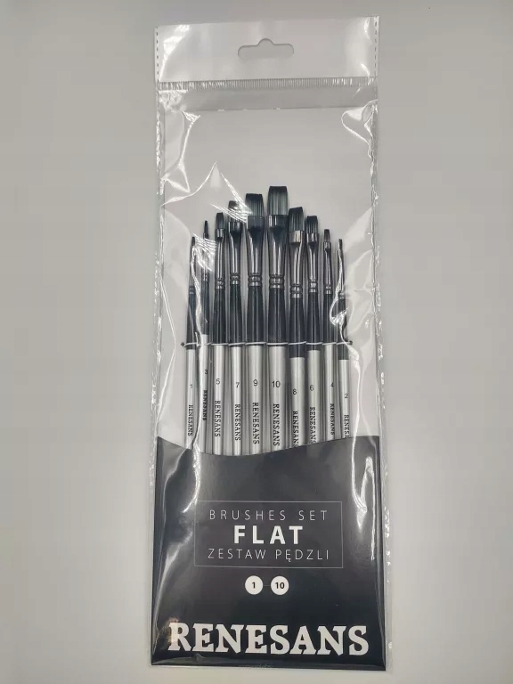 синтетичні щітки ренесансу, призначені для температури та гуашів. Їх також можна використовувати для акрилових фарб. Короткий пофарбований срібний -лак -вал, нікельські теги та синтетичні, двоколеної нейлонової щетини. Широкий асортимент розмірів дозволить правильно вибрати розмір пензля для призначеної роботи. Чорні та сірі щетини характеризуються еластичністю та точністю. Для того, щоб щітки тривалий час зберігали свою форму та якість, слід використовувати відповідні підготовки до догляду та очищення. Набір включає 10 штук плоских щіток, розмірів, послідовно, від 1 до 10.