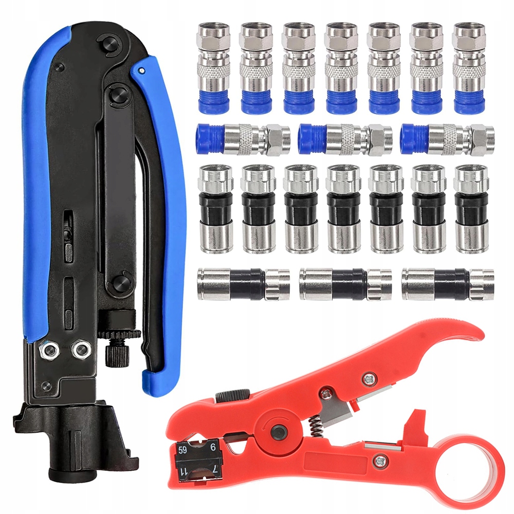 Набір концентричного обтиму включає: 20 чоловічих шматочків ( 10 синіх + 10 штук ) + 10 Жіночі шматки RG6 + 1 ПК. Затискач для концентричного + 1 шматок концентричного пуфера є оборотною, одна сторона доступна для RG 59/6, 7/11