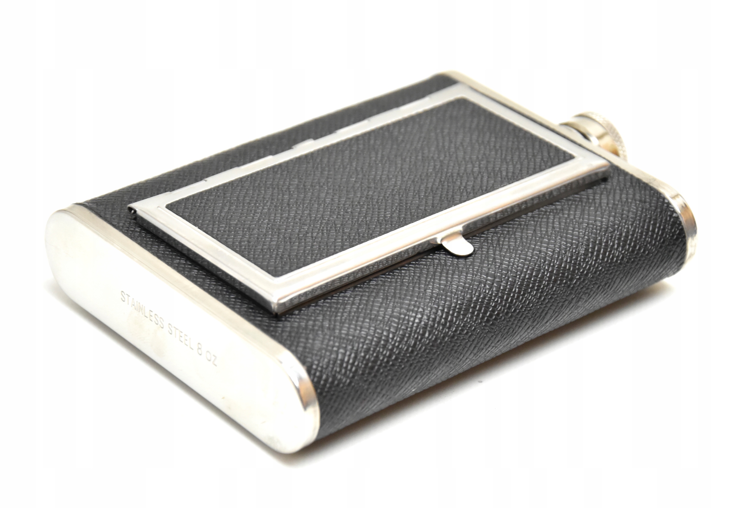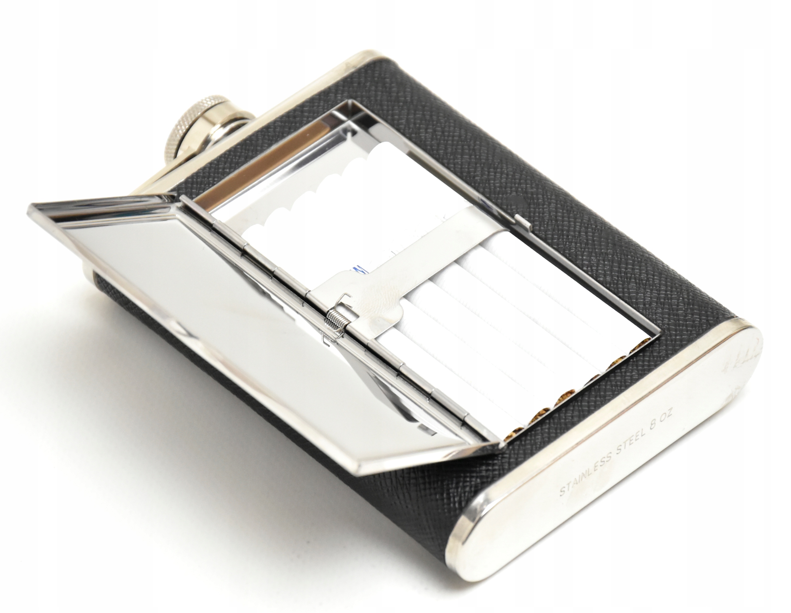 - Крім своєї звичайної функції, фляжка має прихований портсигар спереду, який може вмістити 6 стандартних, товстих або сотні сигарет. < /ul>