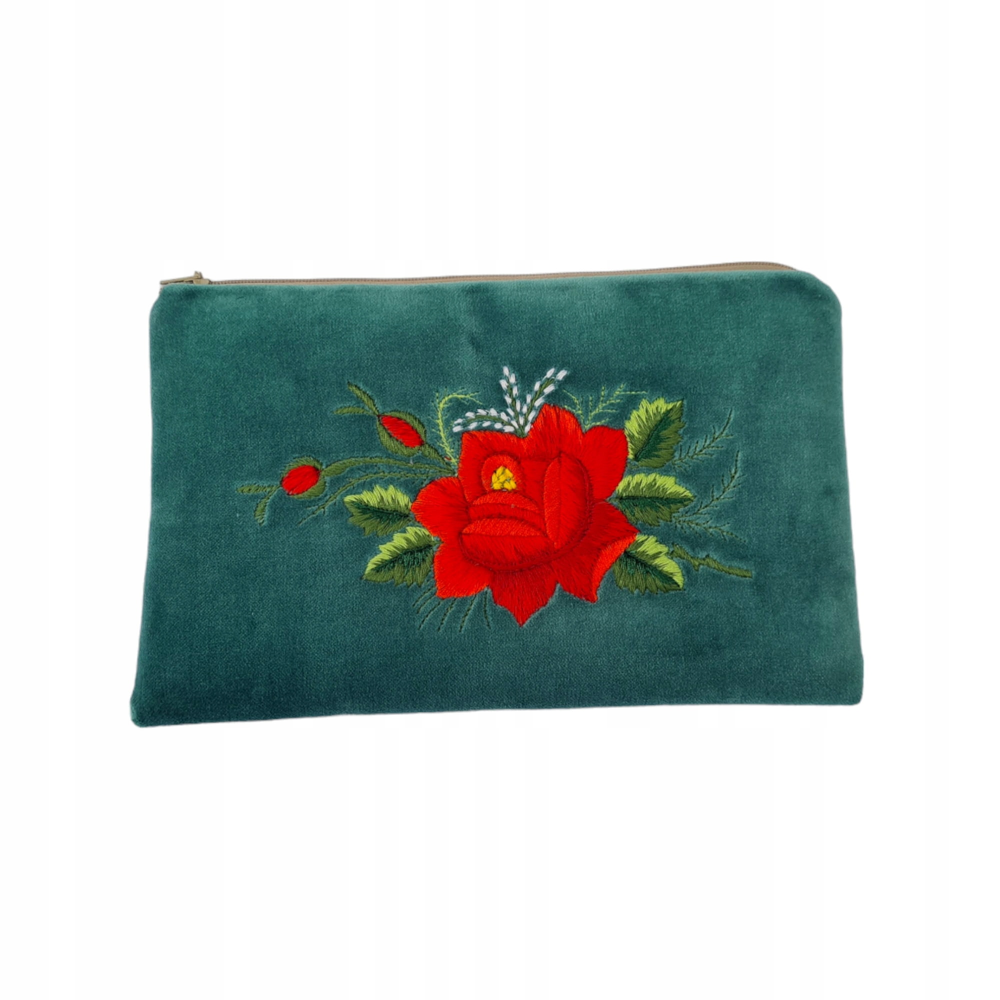 Елегантна косметичка кольору пляшки, прикрашена вишивкою Łowicz із зображенням червоної троянди.