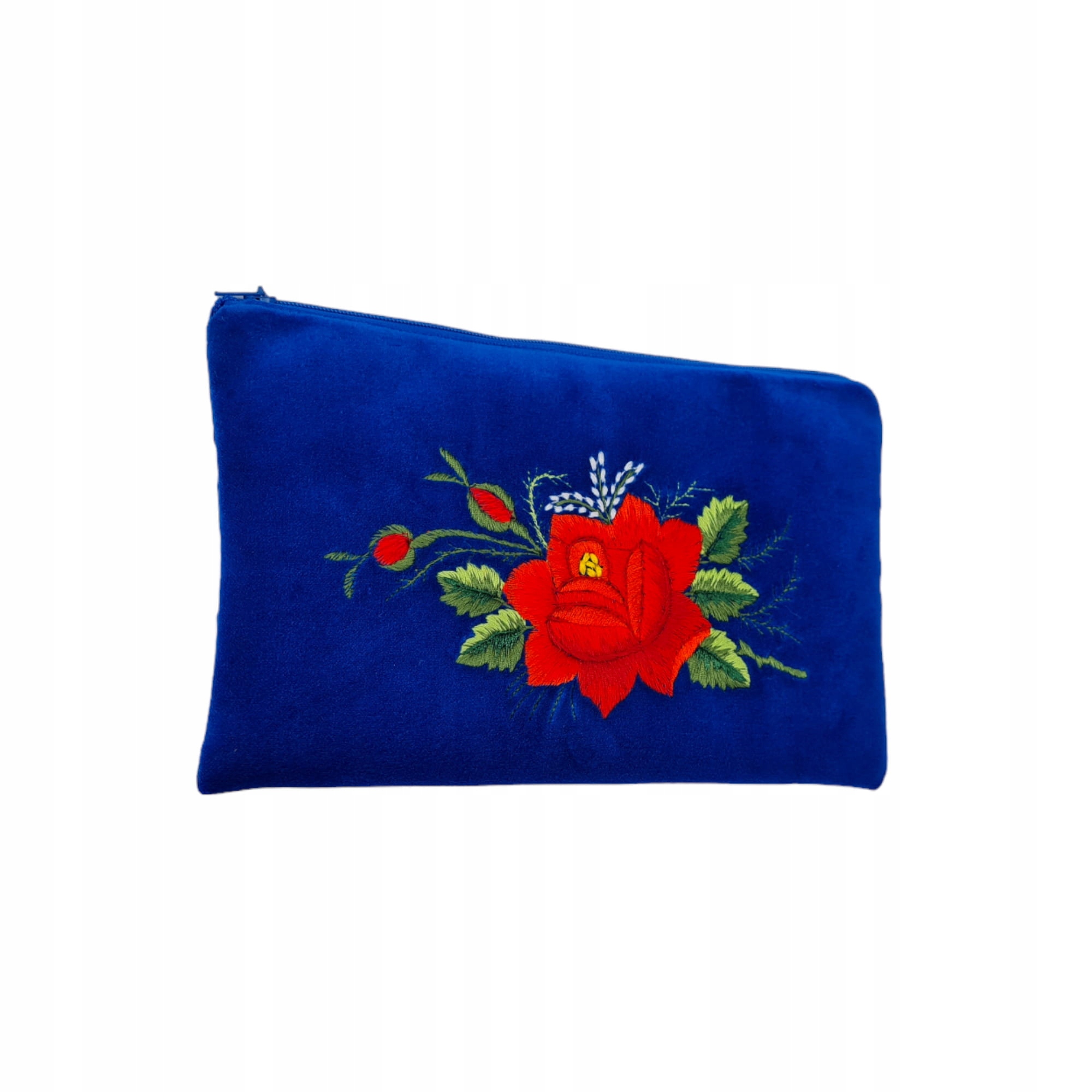 Плоска народна косметичка, прикрашена вишивкою Łowicz із зображенням червоної троянди. Зроблений вручну з елегантного блакитного оксамиту, цей унікальний аксесуар дозволить вам стильно зберігати необхідну косметику та аксесуари. Вишивка Łowicz, виконана за допомогою ручної машинної техніки, надає косметичці унікальний характер, навіяний польською народною традицією.