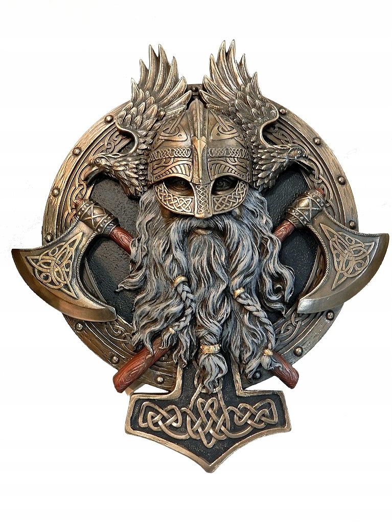 Запрошую придбати чудову настінну маску в скандинавському стилі. На ній зображено голову вікінга з довгою щетиною і шолом на тлі двох схрещених сокир і круглого щита. Фантастичний стиль і точність виконання.