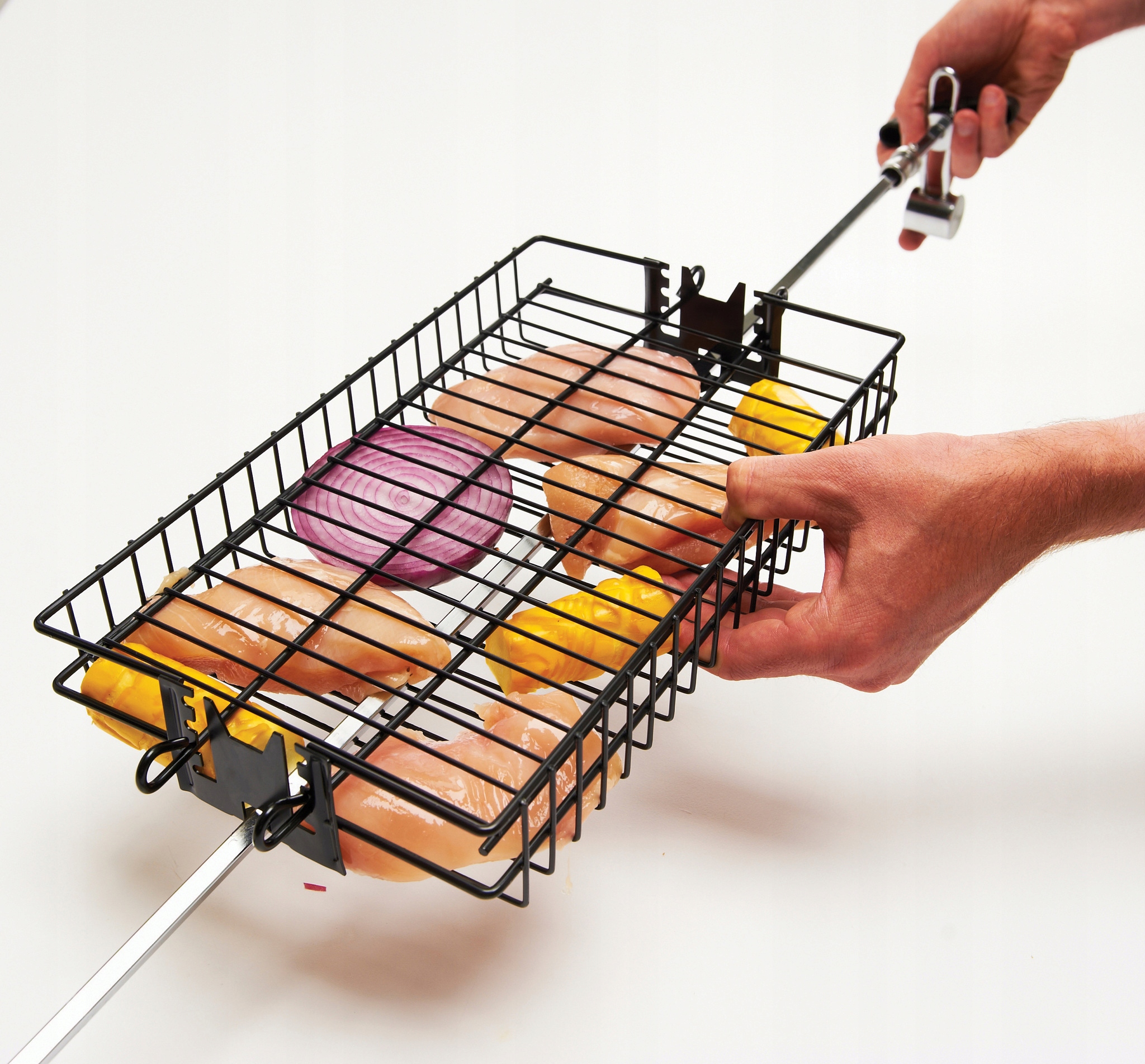 Гриль у кошику на рожні також дозволяє страві рівномірно просмажуватися з усіх боків. Завдяки можливості регулювати висоту кришки в кошику, ви завжди можете підігнати її під необхідні розміри.