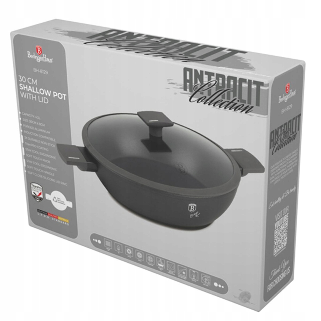 горщики, каструлі та аксесуари з серії колекцій Antracit від Берлінгера Хауса виготовлені з алюмінію високого класу, покритого всередині потрійним титановим титаном Pro, з дуже високим коефіцієнтом твердості. Зовнішнє покриття в матовому антрациті. Ці привабливі та модні страви оснащені як стандартні з м'яким дотиком (силіконова ручка). Пристосований до всіх видів плит: газ, електричний, керамічний, галоген, індукція. Система турбо -індукції (вони нагріваються дуже швидко) економить до 35% енергії. Розміри