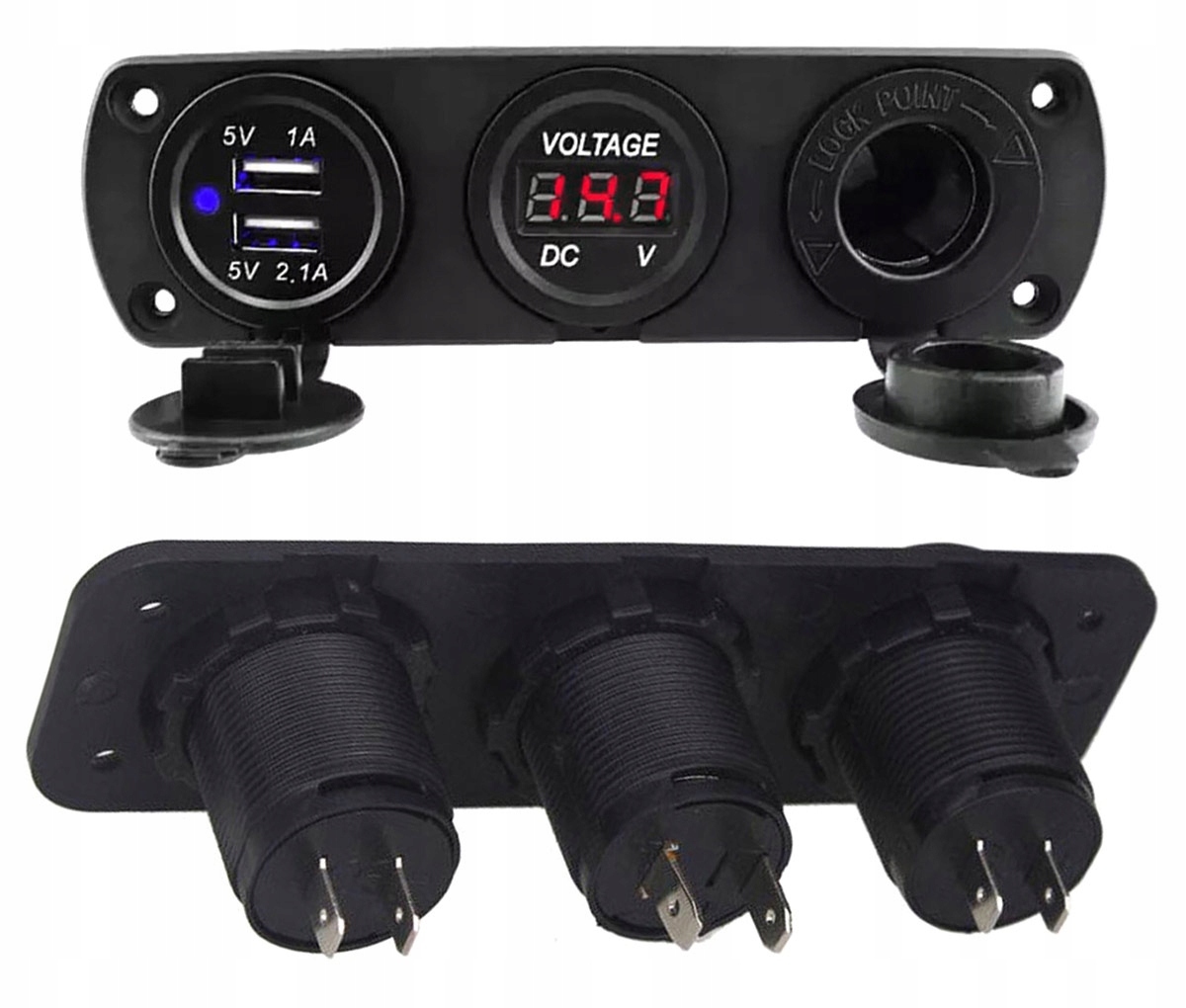 Гніздо прикурювача на 12 В з двома портами USB 5 В і вбудованим вольтметром. Ідеально підходить для використання в автомобілях, мотоциклах, мопедах, квадроциклах і скутерах, іншими словами, у всіх автомобілях, які мають автомобільний прикурювач на 12 В. Він дозволяє використовувати два додаткових порти USB зі струмом 2,1 А та 1 А, зберігаючи при цьому повну функціональність автомобільного прикурювача та вбудованого вольтметра з дисплеєм, що дозволяє вимірювати поточну напругу.