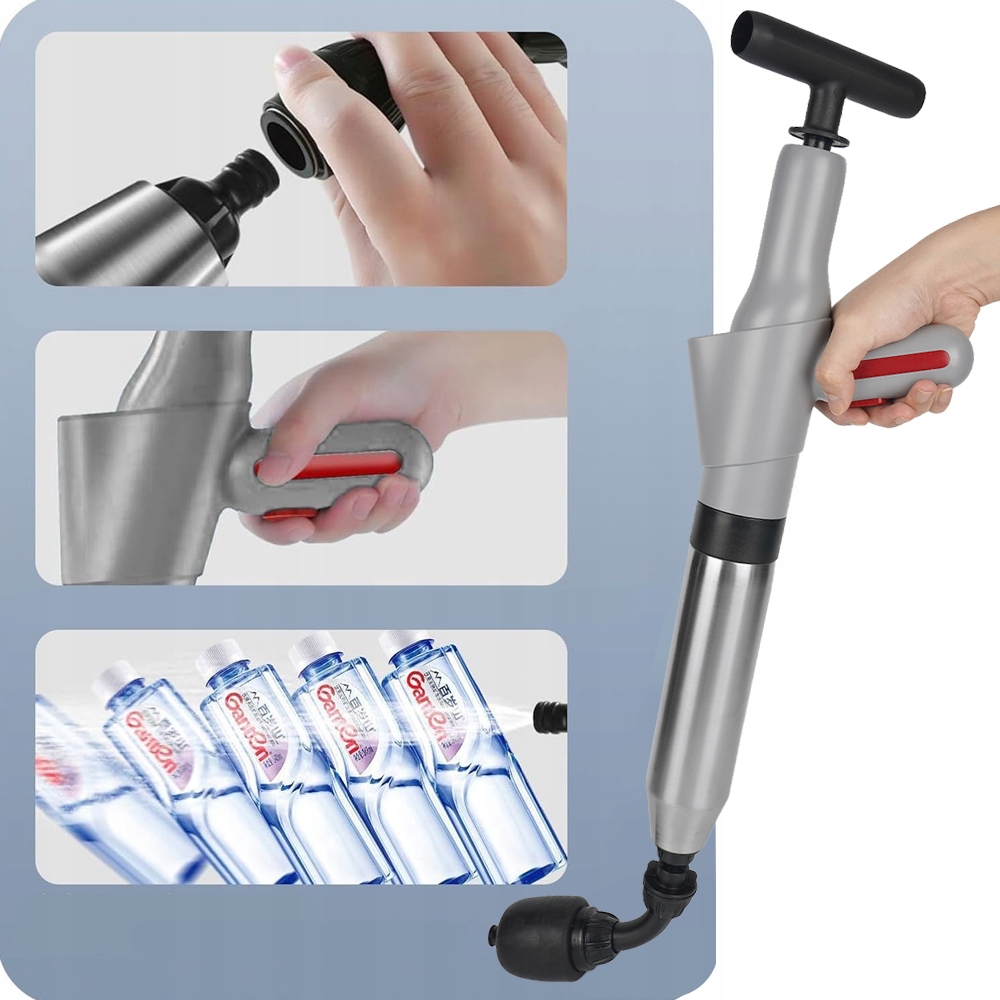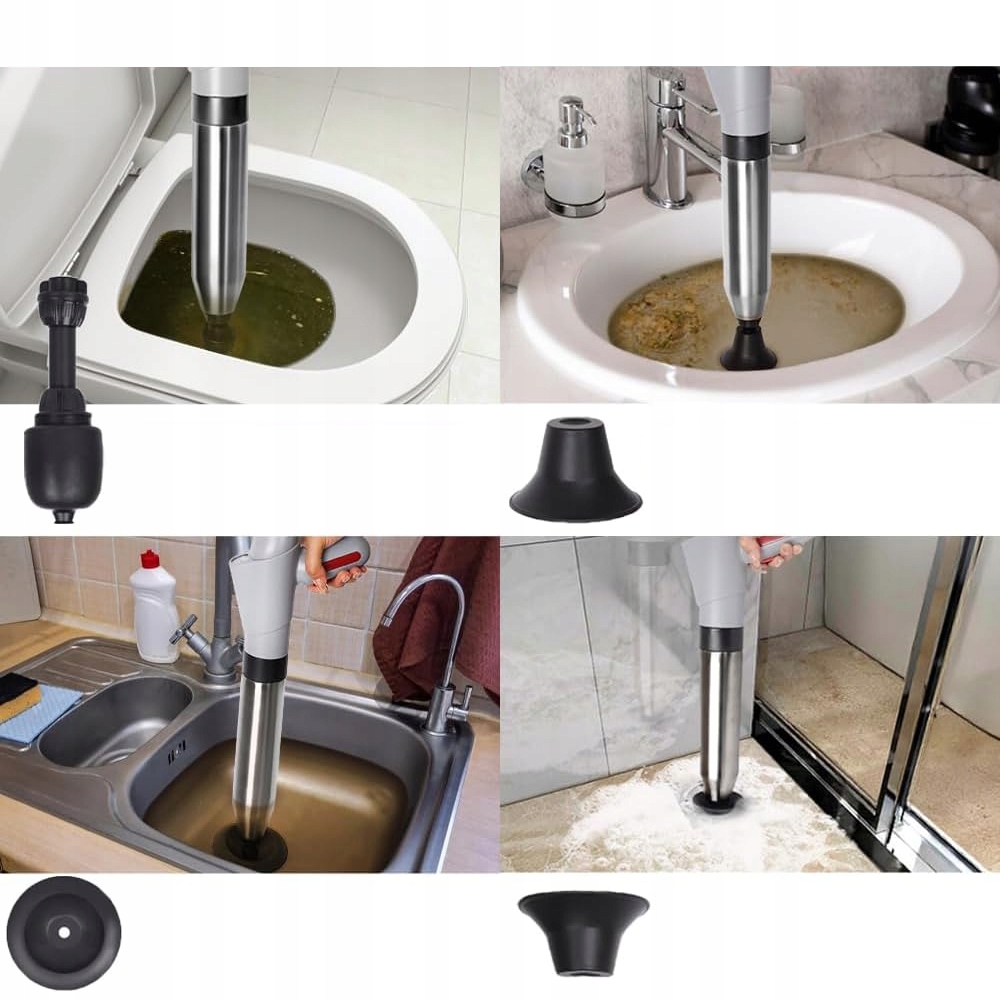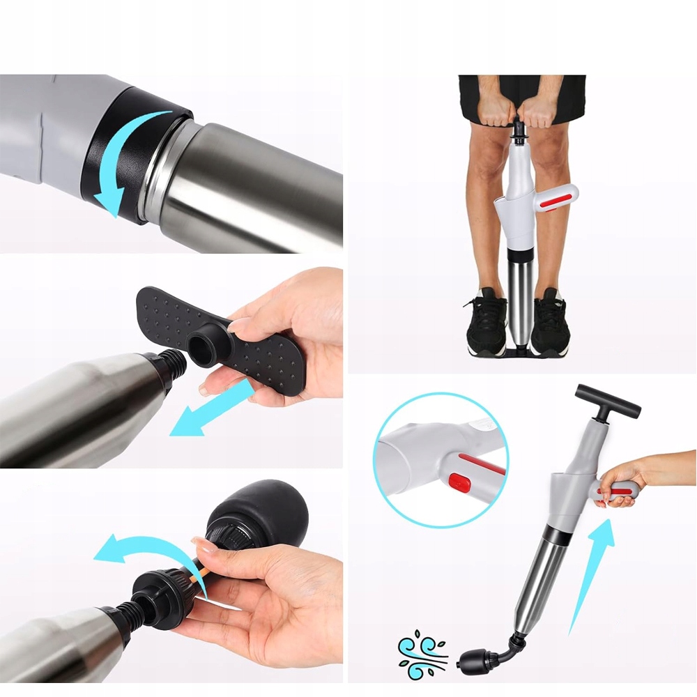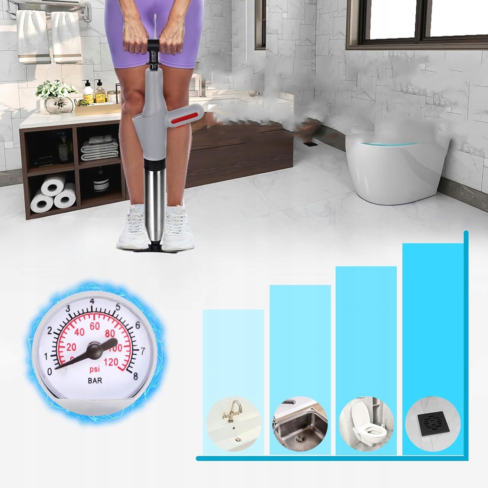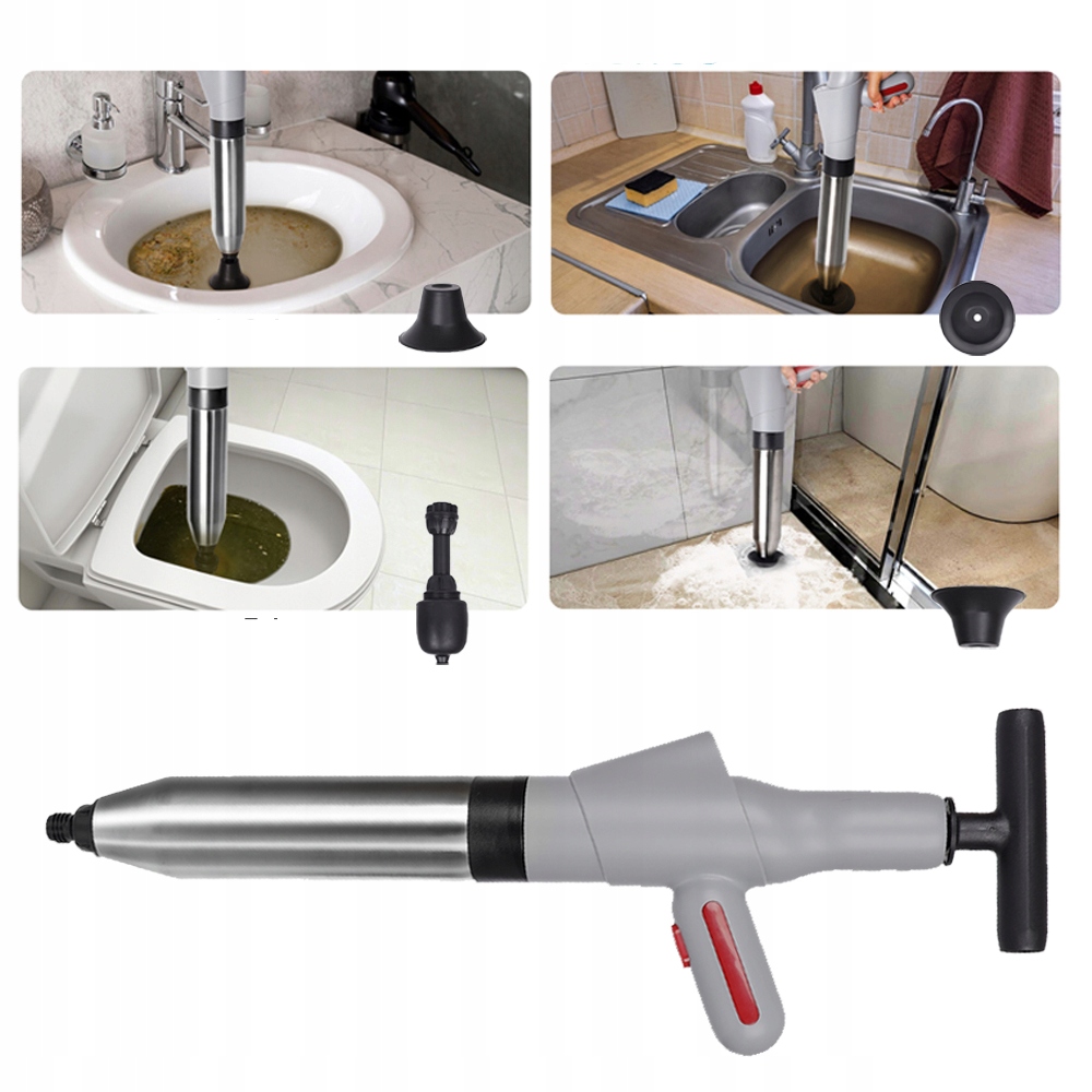 Очищувач труб використовує силу стисненого повітря під високим тиском, щоб легко усунути засмічення з вашого трубопроводу за лічені секунди. Покращена конструкція трубчастої балони має вигин на 360 градусів без глухих кутів, що ідеально підходить для використання на засміченому унітазі. Поршень легко вставляти та знімати, він ідеально підходить для використання як насос для очищення стоків або плунжер унітазу.