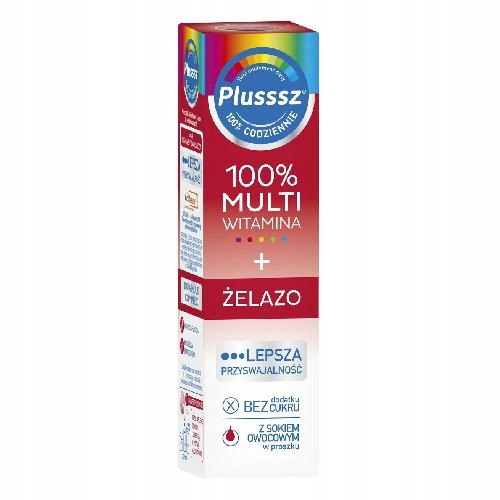 Plusssz 100% Multivitamin + Iron — спеціалізований препарат, що містить комплекс 10 найважливіших вітамінів у кількості, що забезпечує 100% добової референтної норми споживання для дорослим по 1 табл. Крім того, він містить необхідне для організму залізо, яке сприяє правильному виробленню червоних кров’яних тілець і гемоглобіну.