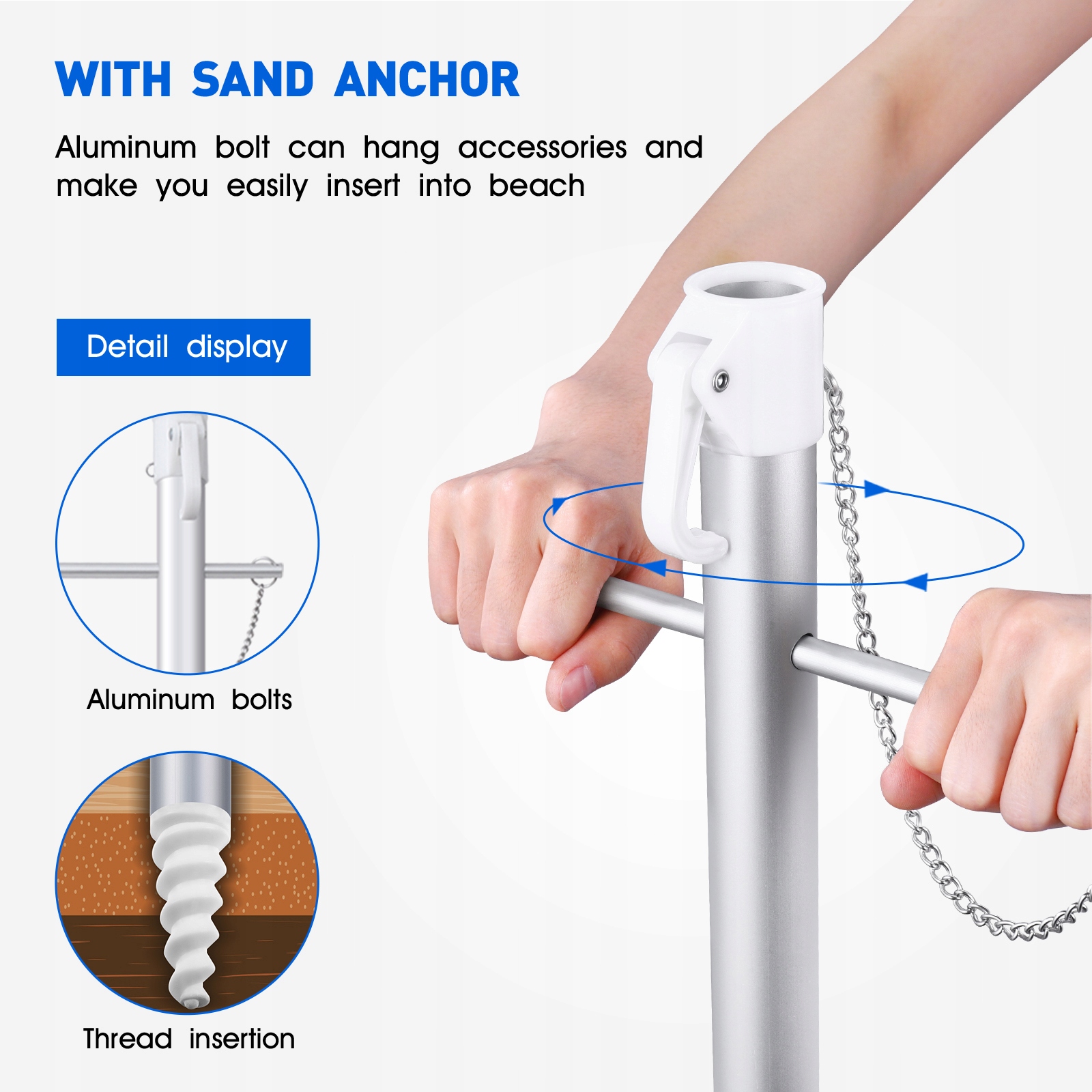 - Зроблено із міцними алюмінієвими стовпами, що не ржавіють, а також вбудованим кріпленням для піску, який міцно тримає парасольку на місці.
