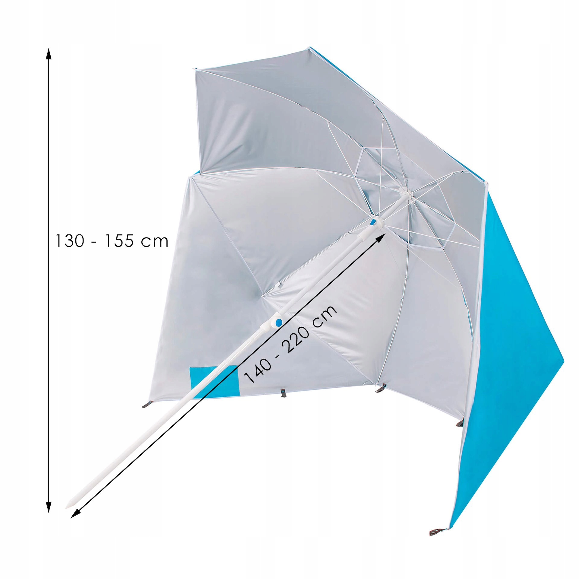 Уміст регулювання висоти . Це дозволяє відрегулювати довжину ніг від 140 до 220 см. Завдяки цьому ви можете отримати максимальну висоту парасольки в межах 130-155 см. Це дозволить вам комфортно відпочити всередині.