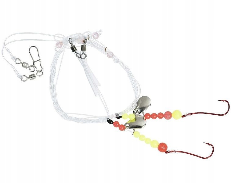Набір містить дві стрічки з червоними гачками для кріплення наживки, запобіжна шпилька та вертлюг для кріплення набору до основної волосіні.
