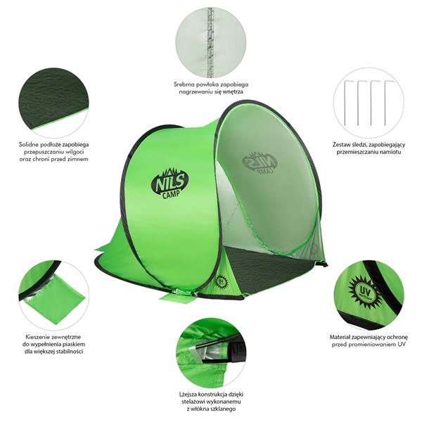 Пляжний намет саморозкладний. Його розміри гарантують зручність і комфорт використання. Головною перевагою моделі NC3173 є те, що вона сама розкладається. Просто вийміть його з кришки та покладіть на землю. Через кілька секунд намет готовий. В результаті ми можемо швидко віддатися блаженному відпочинку. Завдяки прищіпкам, що входять в комплект, виріб не буде рухатися і немає ризику бути віднесеним вітром. Додатково в наметі є спеціальні кишені, які можна наповнити піском. Вони також розроблені для запобігання небажаного переміщення намету.