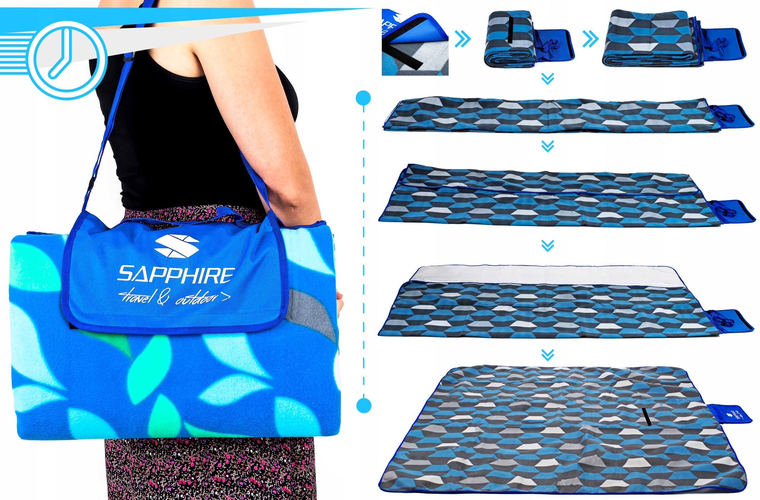 Використання фліс 200 г/м2 робить ковдру м'якою на дотик, тоді як практичні ручки та система липучок дозволяють швидко змінити ковдру на невелику сумку, яку можна легко перевезти. Він поміститься в багажник кожного автомобіля! Ковдра для пікніка Сапфіра -це обов'язкове пропозиція для всіх людей, які люблять сім'я відпочивати на відкритому повітрі!