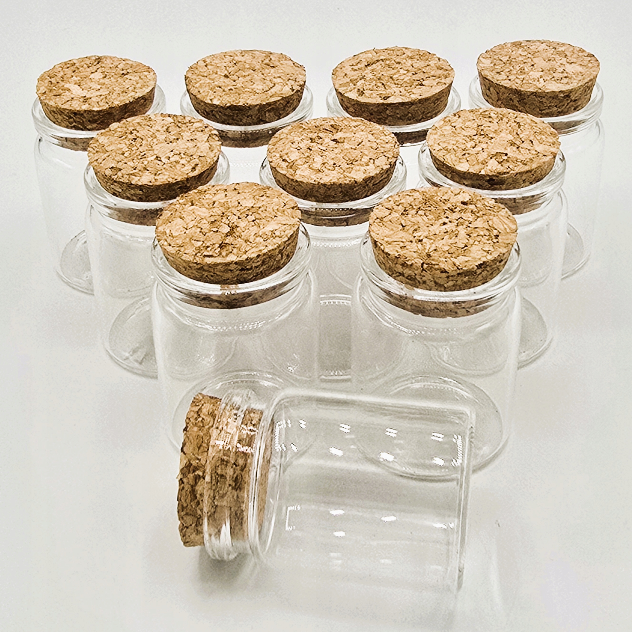 Набір з 10 прозорих скляних пляшок - банок з пробками.
