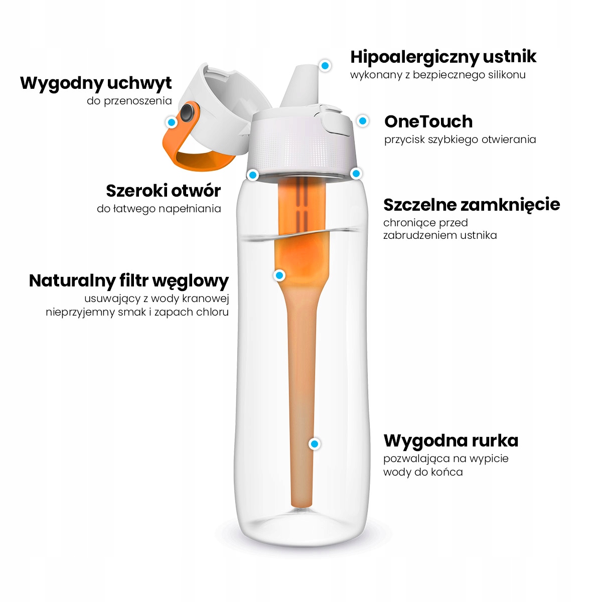 Суцільна пляшка з фільтром бурштинового/помаранчевого кольору, виготовлена з міцного Tritan®, спроектована та виготовлена в Польщі. Пляшка створена для людей, які цінують регулярне зволоження організму, займаються спортом і ведуть здоровий спосіб життя.